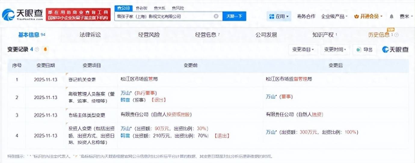 根据天眼查的信息,『韩雪』名下目前仅关联一家公司——『韩雪』(上海)影视文化工作室。值得注意的是,『韩雪』此前与丈夫万山共同持有雪孩子家(上海)影视文化有限公司,但近日她已经退出了该公司,退出前持股达到70%。目前,万山全资持有该公司,两人不再有共同的公司关系。