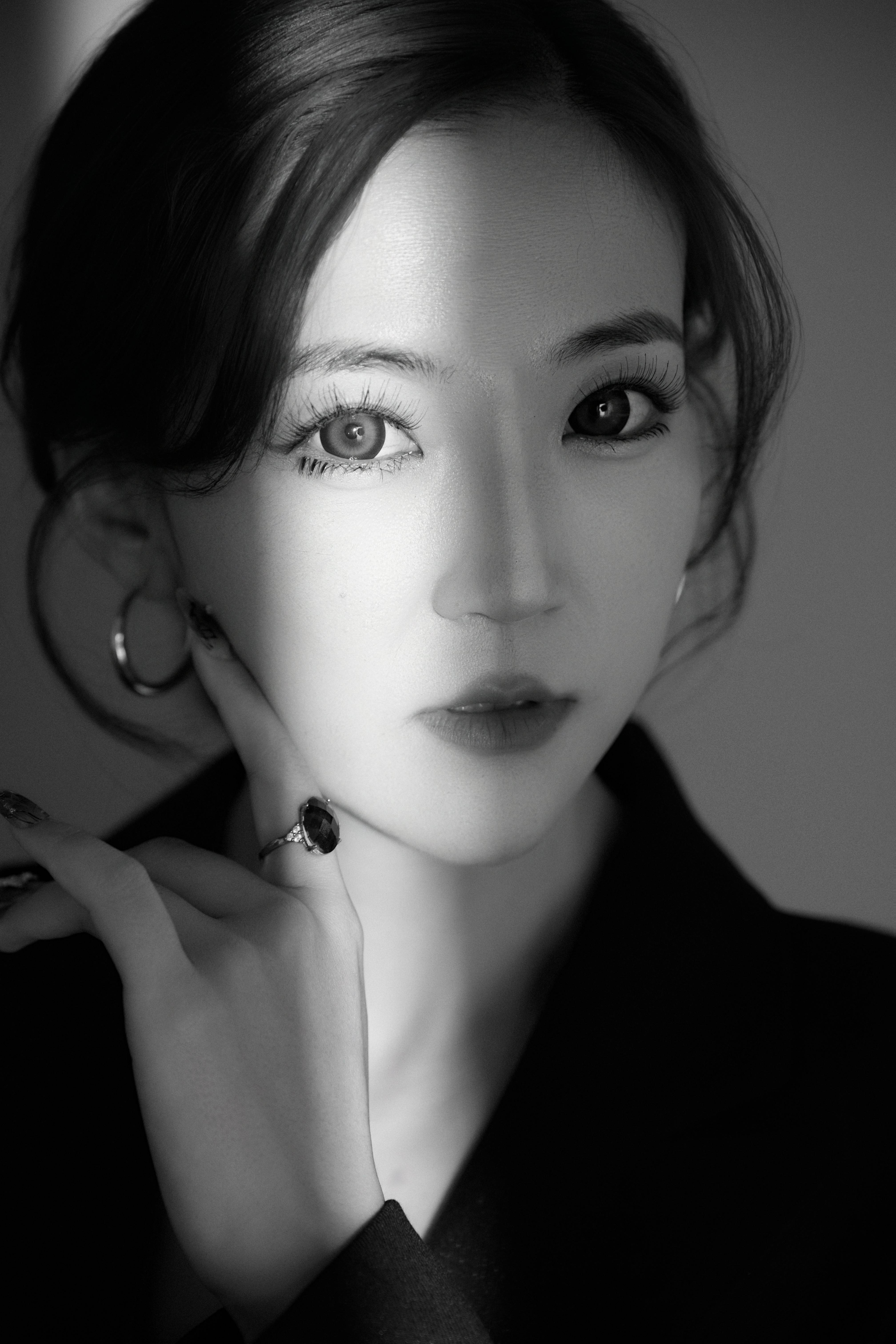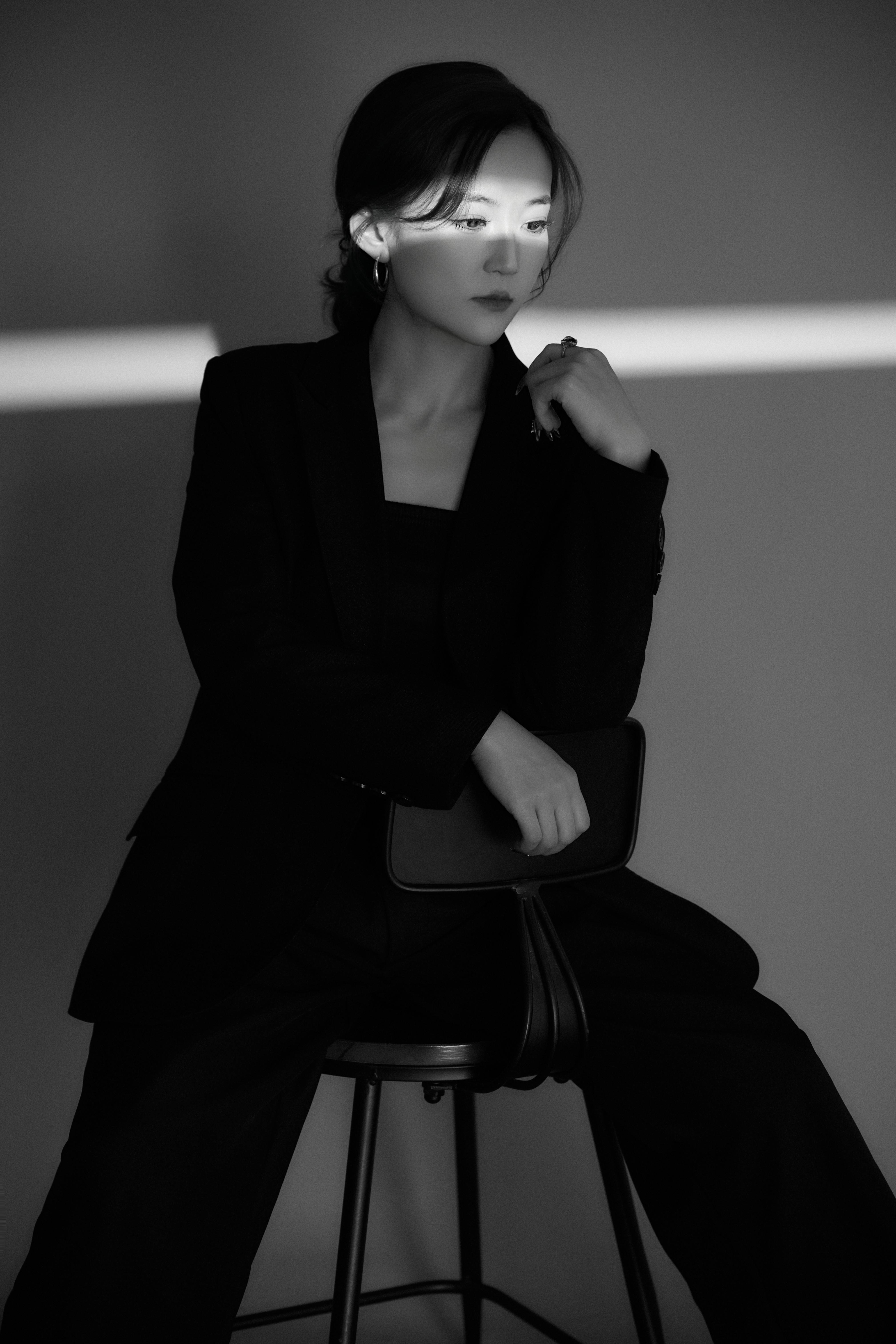 她的第一组镜头是极简黑西装。宽肩廓形裹着清瘦的骨架,却没半分单薄 —— 内搭的黑色抹胸漏出颈间线条,是凌厉里偷藏的柔;指尖搭在椅背上的弧度,是冷感里漫出的软。镜头里的光影像把裁纸刀,在她侧脸切出明暗交界线,西装的硬挺衬得她眼神更沉,可耳骨上晃着的圆环耳环,又偏偏泄出点未经打磨的松弛。这哪里是穿衣服?是她把新人不该有的笃定,缝进了西装的针脚里。