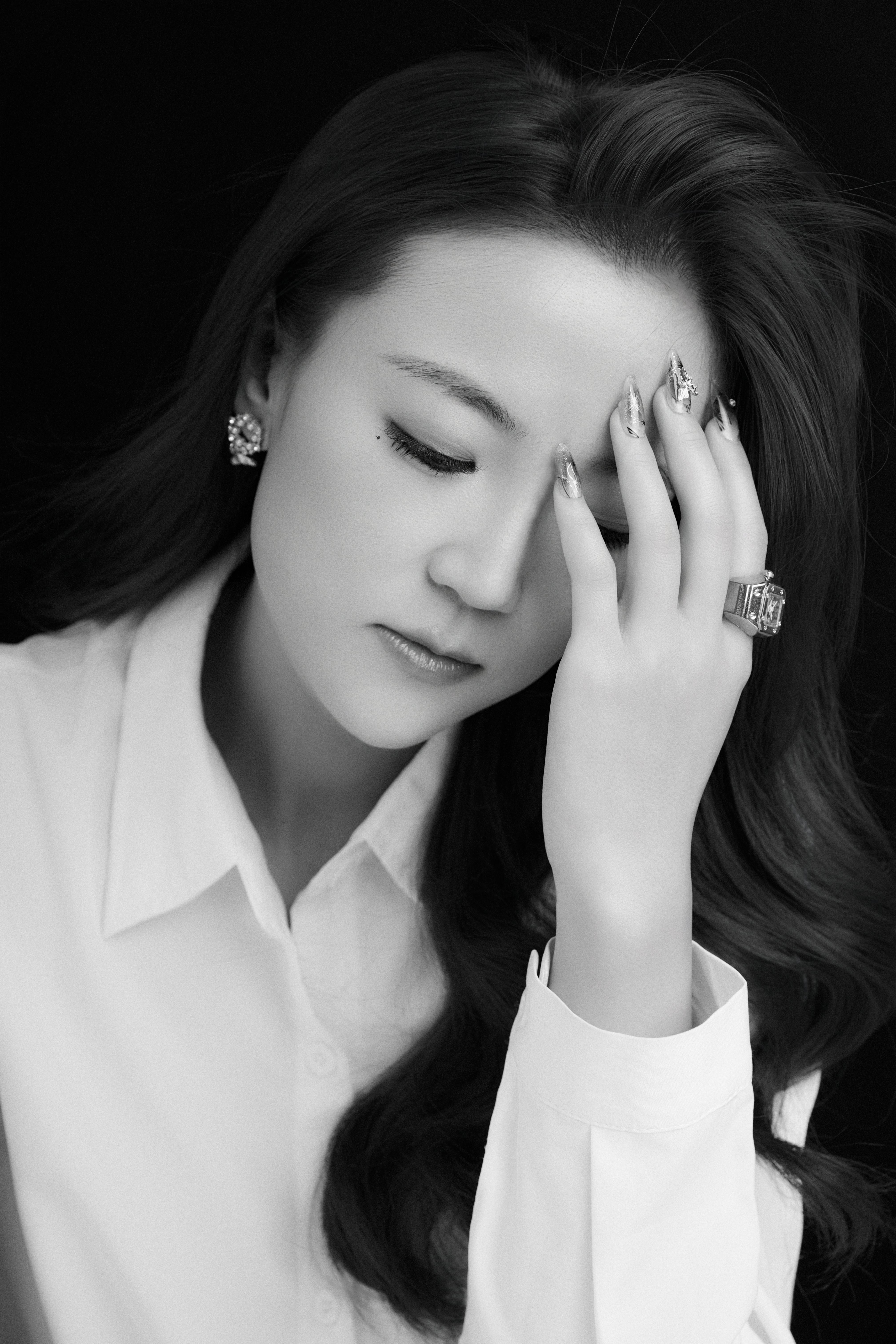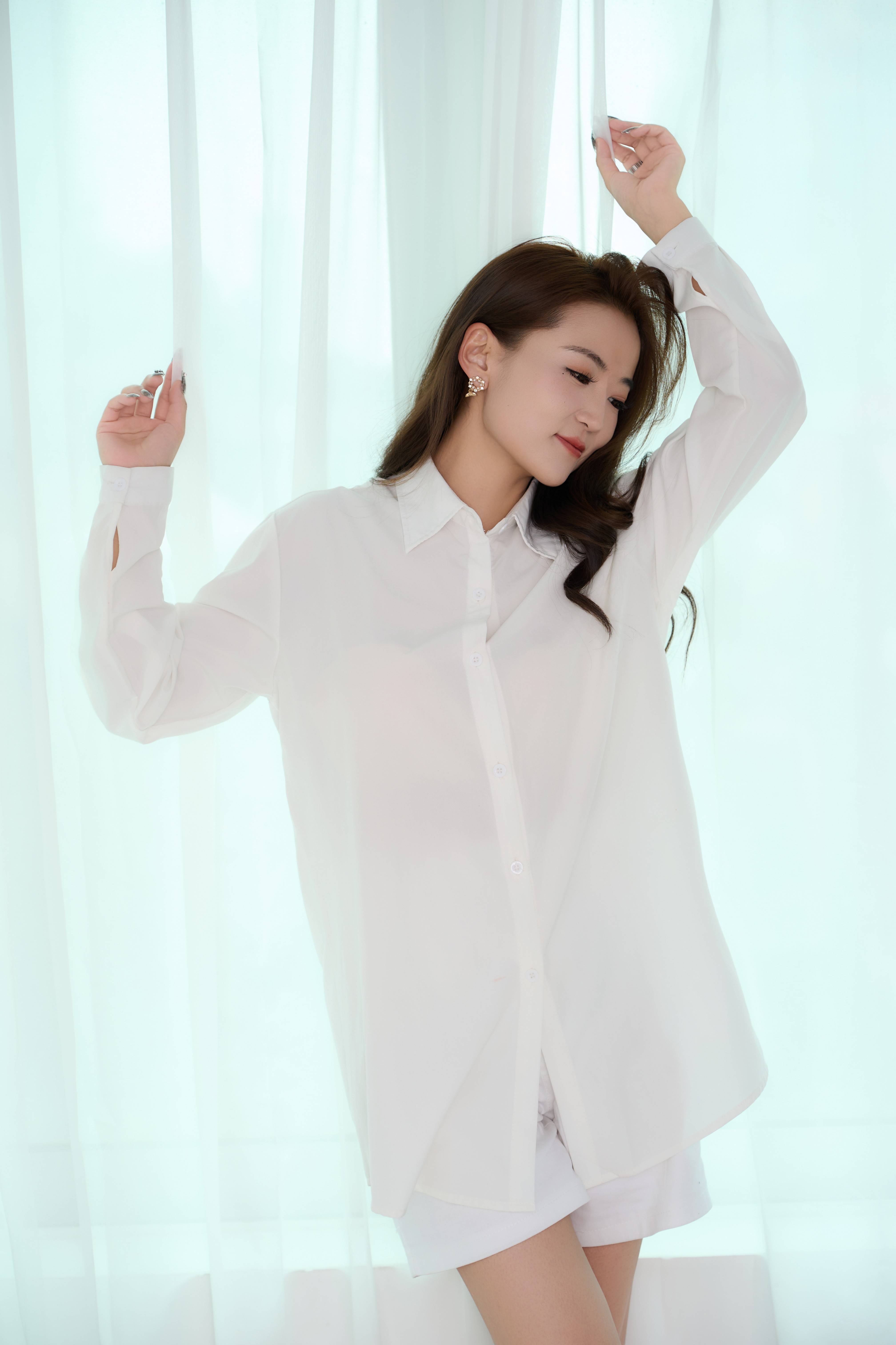 转身换一件白衬衫,又成了另一种模样。 不是职场里板正的白,是像刚拆封的棉絮那样,带着呼吸感的白。她蜷在铺着绒毯的窗边,衬衫下摆松松垮垮盖过腰线,露出的小腿线条是漫不经心的软;指尖勾着窗帘纱的动作,又掺了点不自知的甜。可当镜头拉进,她垂眼抵着眉心时,衬衫领口的褶皱里,又漫出点清冽的距离感 —— 像初夏清晨的风,软和凉都刚好落在人心尖上。