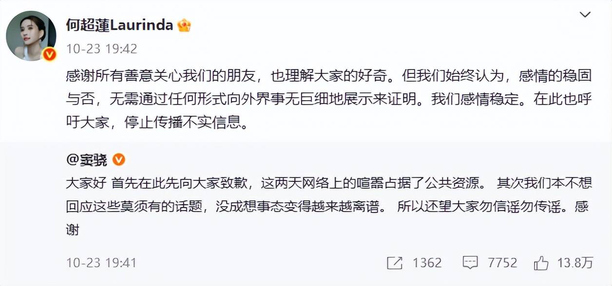 原本有备孕计划的何超莲,将重心放在事业上,生育计划被暂缓,自然引发外界讨论与关注。面对传闻,两人选择不回应,直到舆论风波加剧,才同步发文辟谣。他们表示,本不想理会无端传言,希望大家不信谣、不传谣,目前感情依旧稳定。