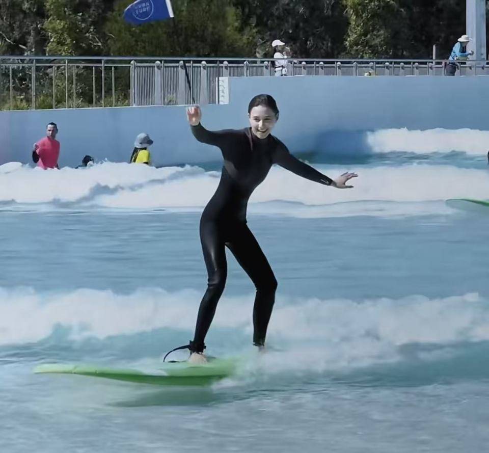 她随后分享了冲浪的视频,尽管多次尝试站稳冲浪板,总是湿透落水,但她始终不放弃,最终成功稳稳站上板面,脸上洋溢着满足的笑容。从『窦骁』视角看去,何超莲既可爱又有趣,还充满魅力。