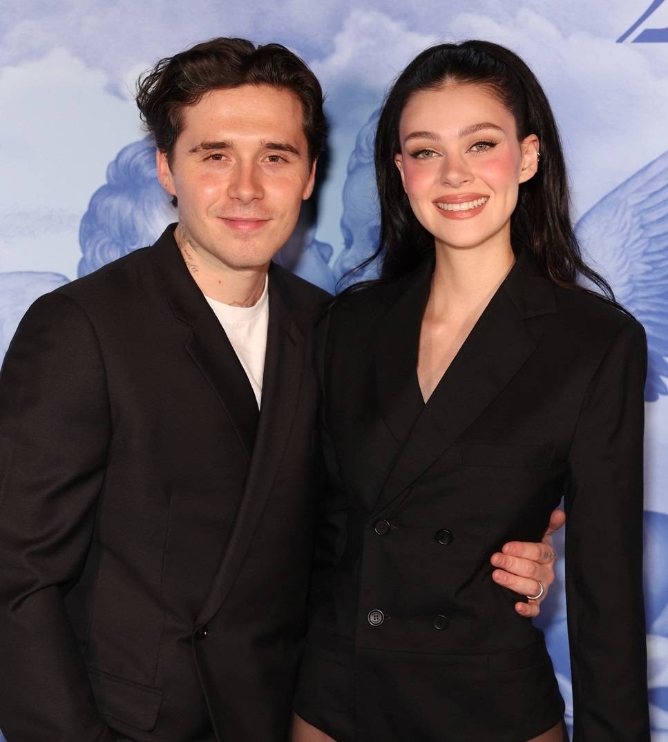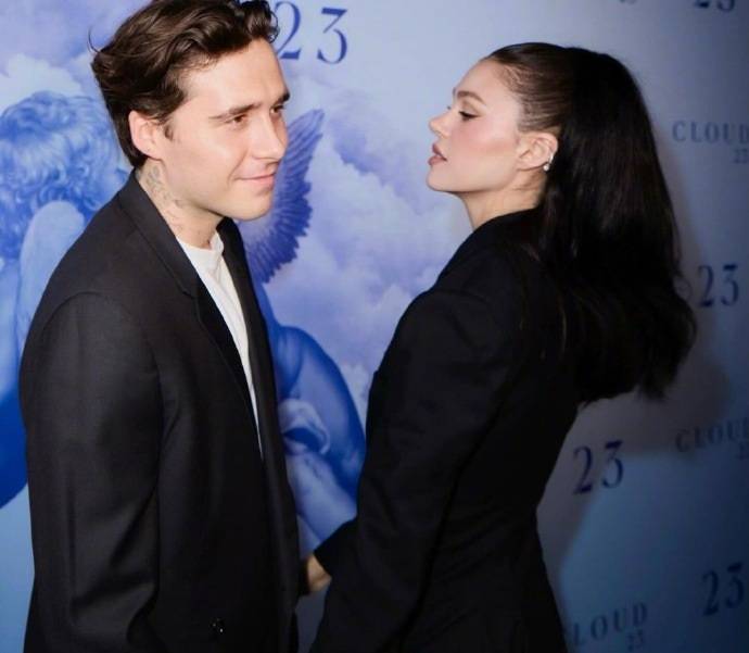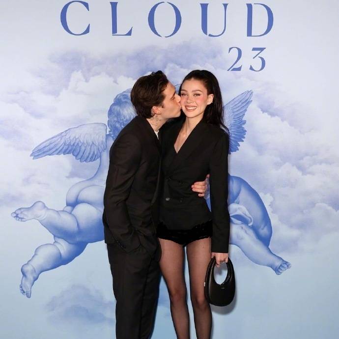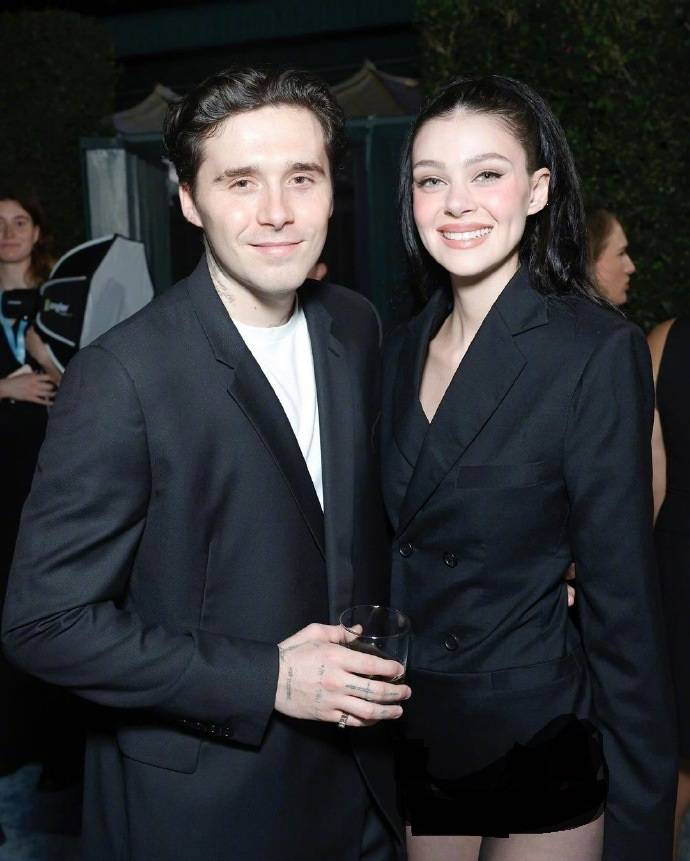 这是布鲁克林和女友妮可拉·佩尔茨相视而笑的样子,两位似乎变成了功成名就的商人。