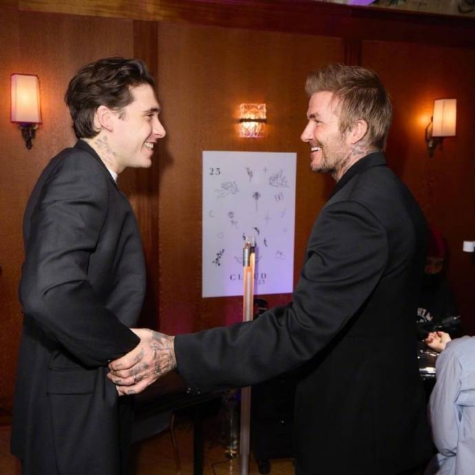 这次贝克汉姆穿的西装笔挺,还留着胡子。他似乎对儿子很满意,贝克汉姆握着儿子手的样子确实是很温馨。他眼睛里充满了父爱,显得好有魅力。