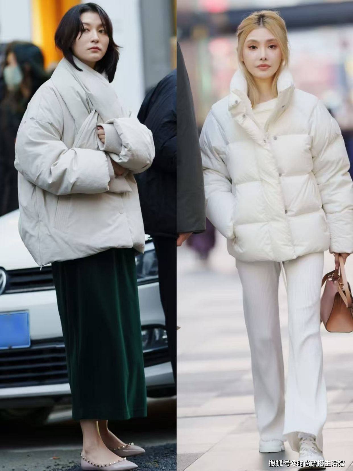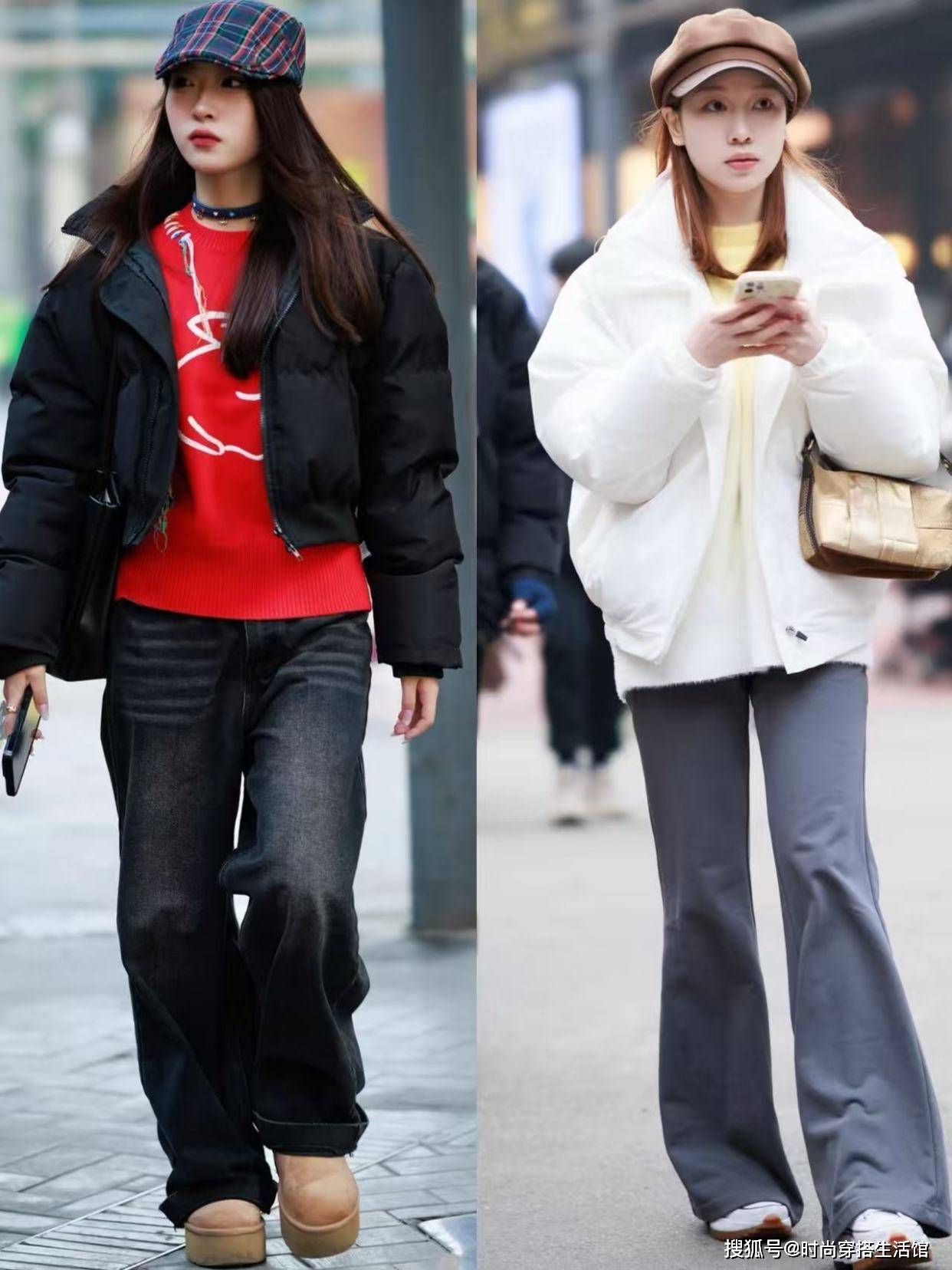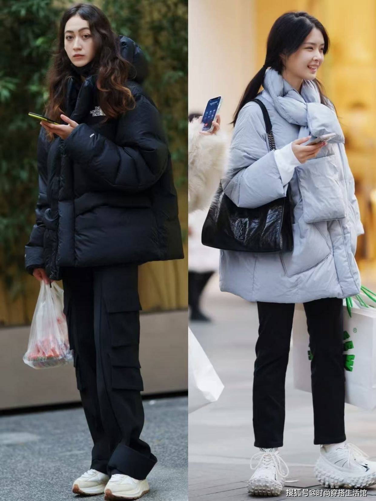 ②羽绒服和下装形成松紧结合,优化身材比例