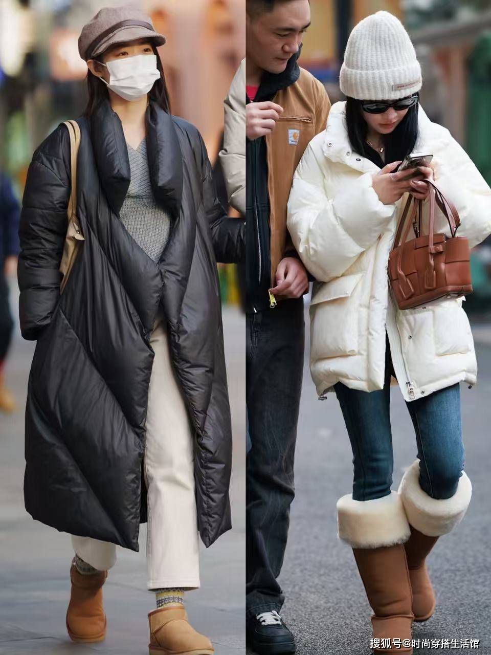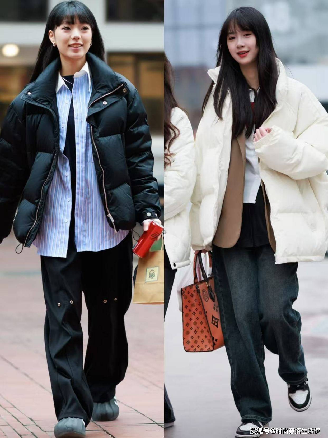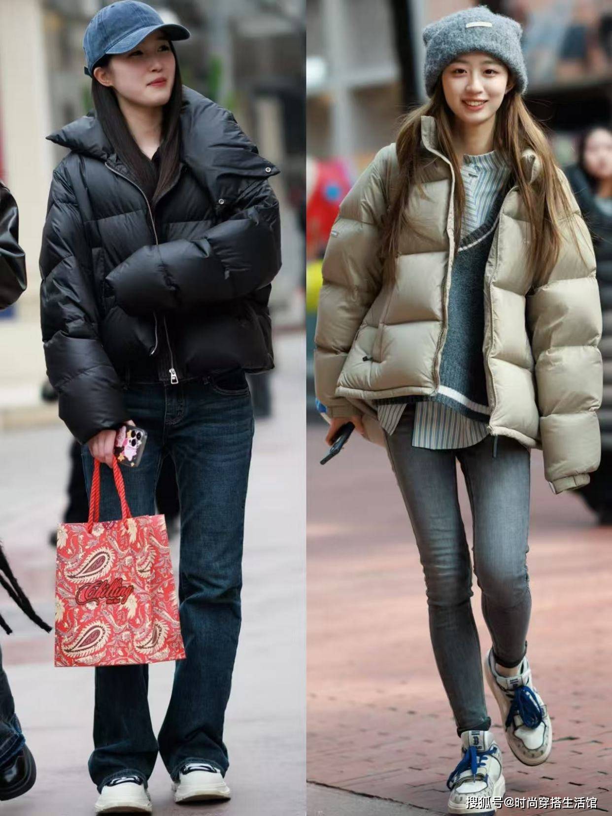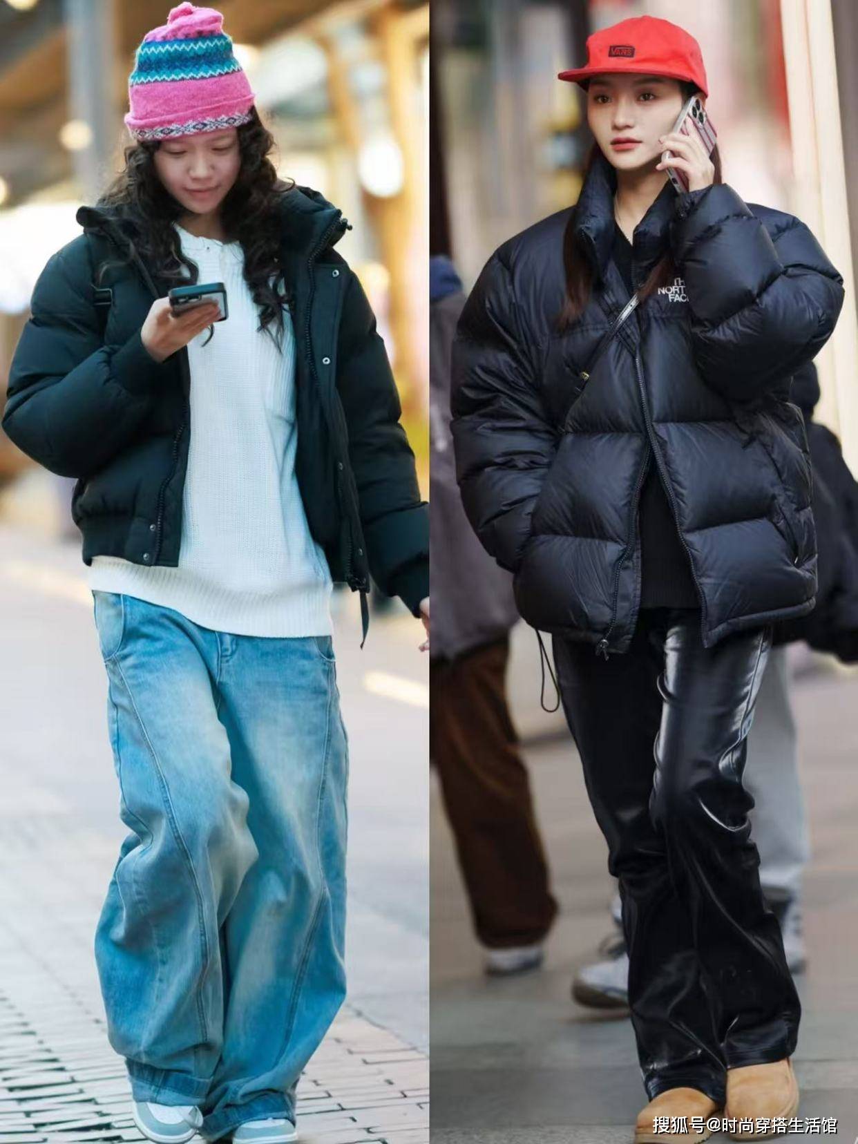 ②羽绒服和下装形成松紧结合,优化身材比例
