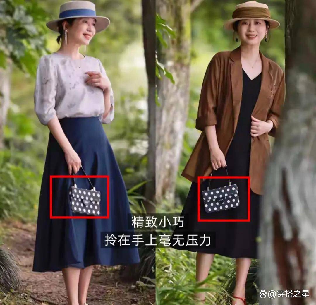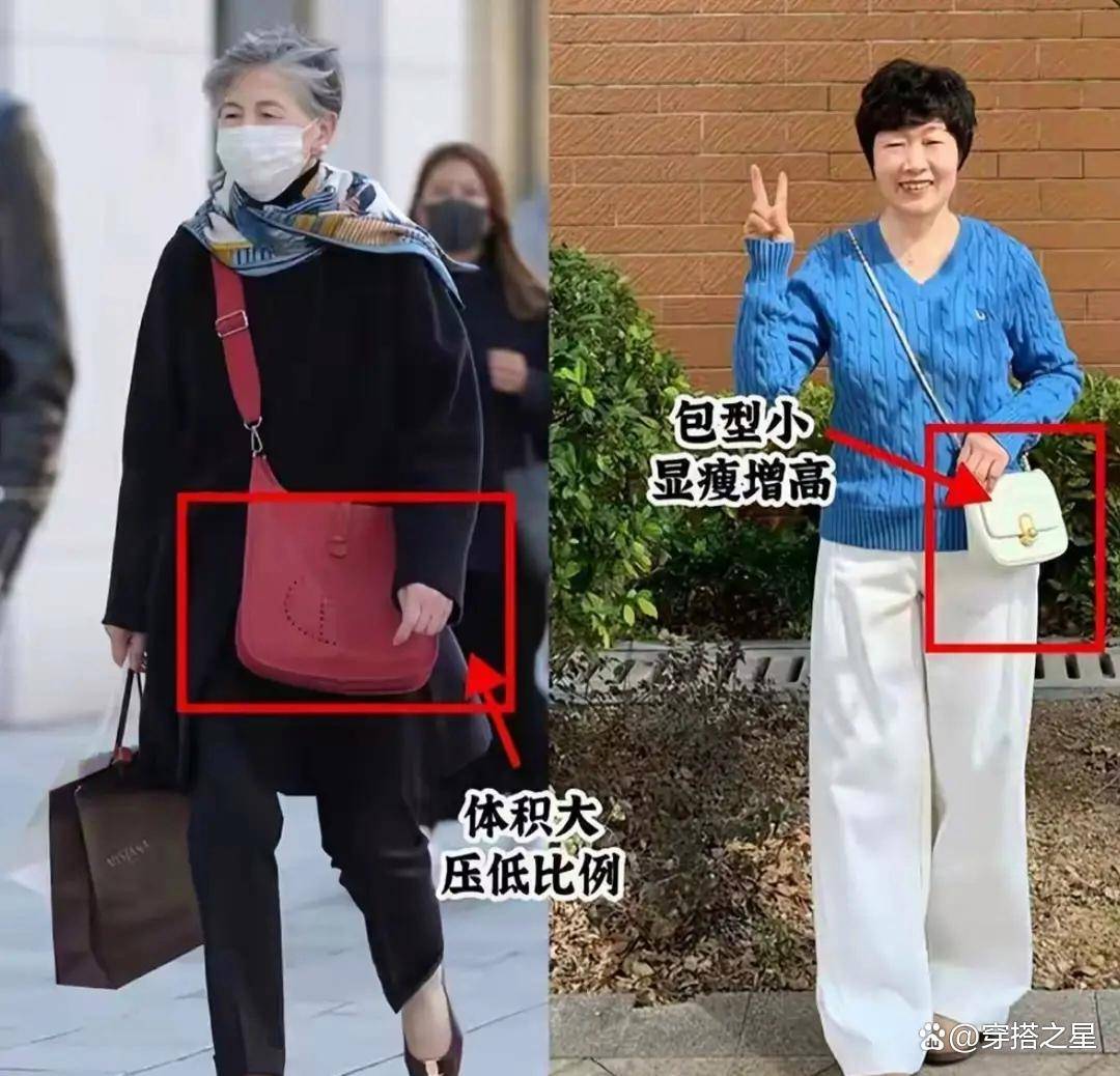 中年女人的造型,成也包包,败也包包,一只包包的大小,往往可以决定最终的搭配结果,不建议选择体积过大的包包,容易压低比例,背在身上也很有负担。
