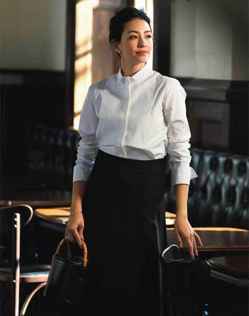 或是把西装裤换成优雅的半身长裙👗,如此着装,不会让衣裳显得太过严肃,反倒带有一份女性♀️独有的韵味。这时,衬衫的风格在很大程度上影响着整体着装风格,要是需要稍稍正式些,那就选择一件基础且稍修身的衬衫与裙装搭配;要是处于休闲场合,一件宽松又或是有设计感的衬衫,便唤醒了着装的时髦感 。