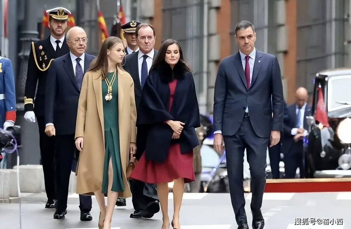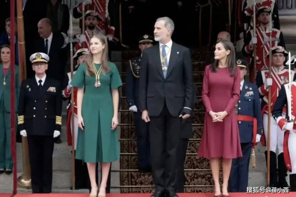作为王位继承人,莱昂诺尔公主的穿着一向备受关注。此次她与母亲共同出席活动,选择了一条绿色的丝绸连衣裙👗,清新脱俗,展现了她独特的气质。绿色裙装的简洁设计,既没有过多花哨的装饰,又恰到好处地突出了她的优雅,搭配一双高跟鞋👠,整体形象显得既高贵又典雅。与莱蒂齐亚的红裙形成鲜明对比,母女俩的搭配更显得相得益彰。