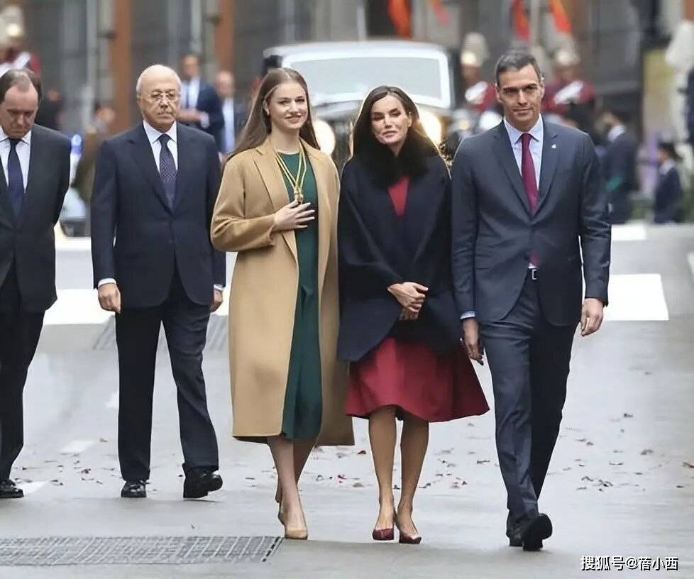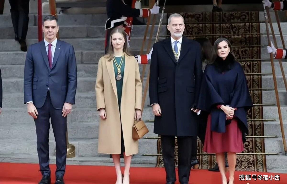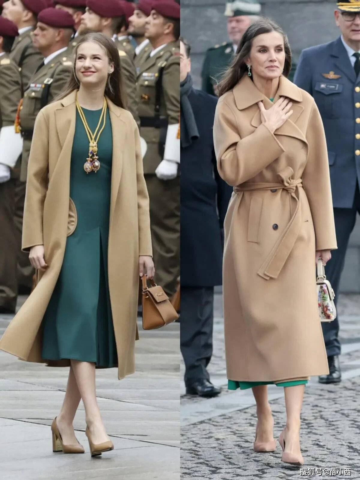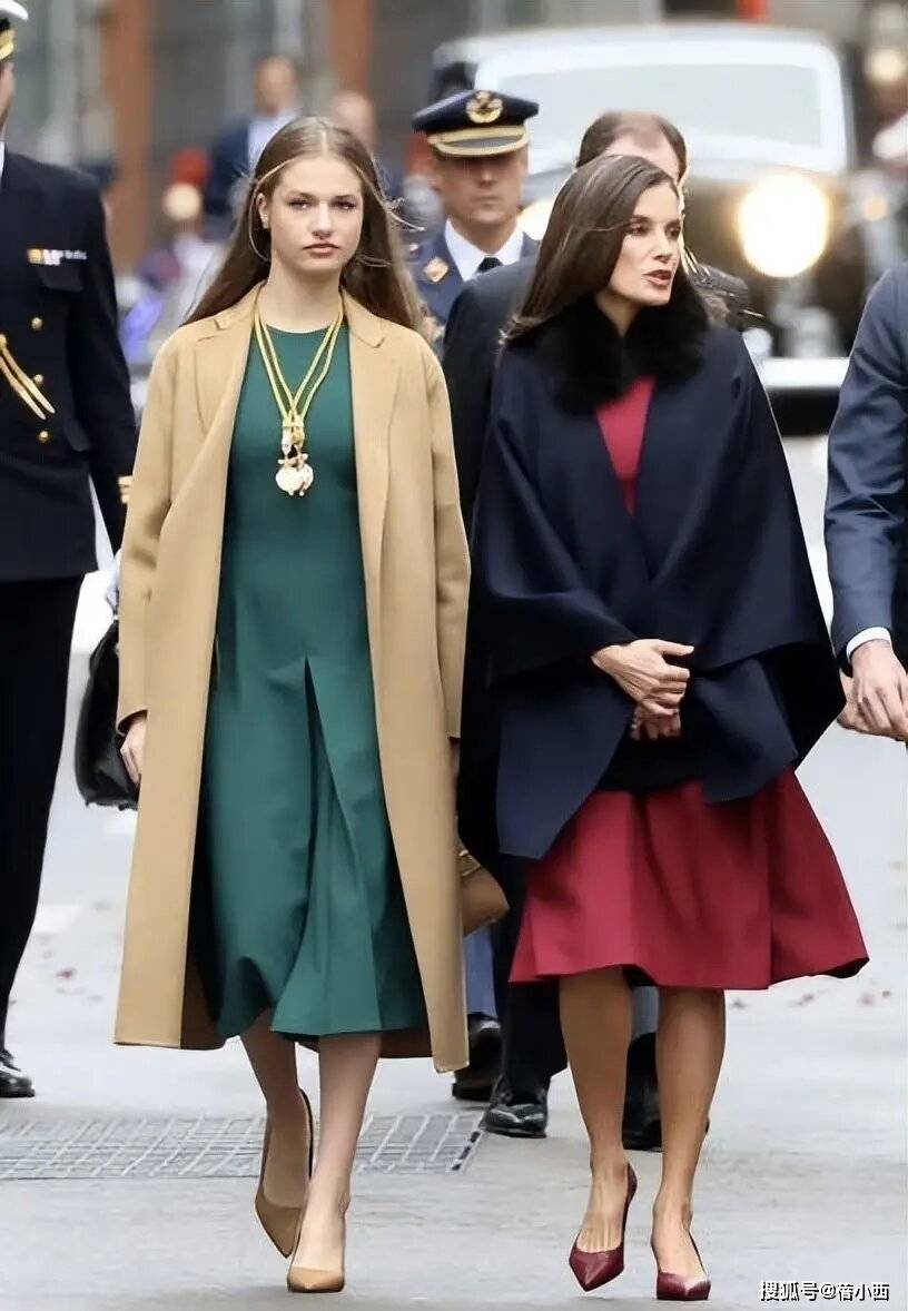 莱昂诺尔公主的外貌和气质无疑展现了她作为未来女王的潜力。她穿着的棕色大衣,曾是西班牙女王莱蒂齐亚的旧款,随着她身高的增长,已经能够轻松撑起这件衣服,显示出她的成长与自信。无论是她的年轻活力,还是母亲的成熟稳重,两人的穿着都展现了不同的王室魅力。
