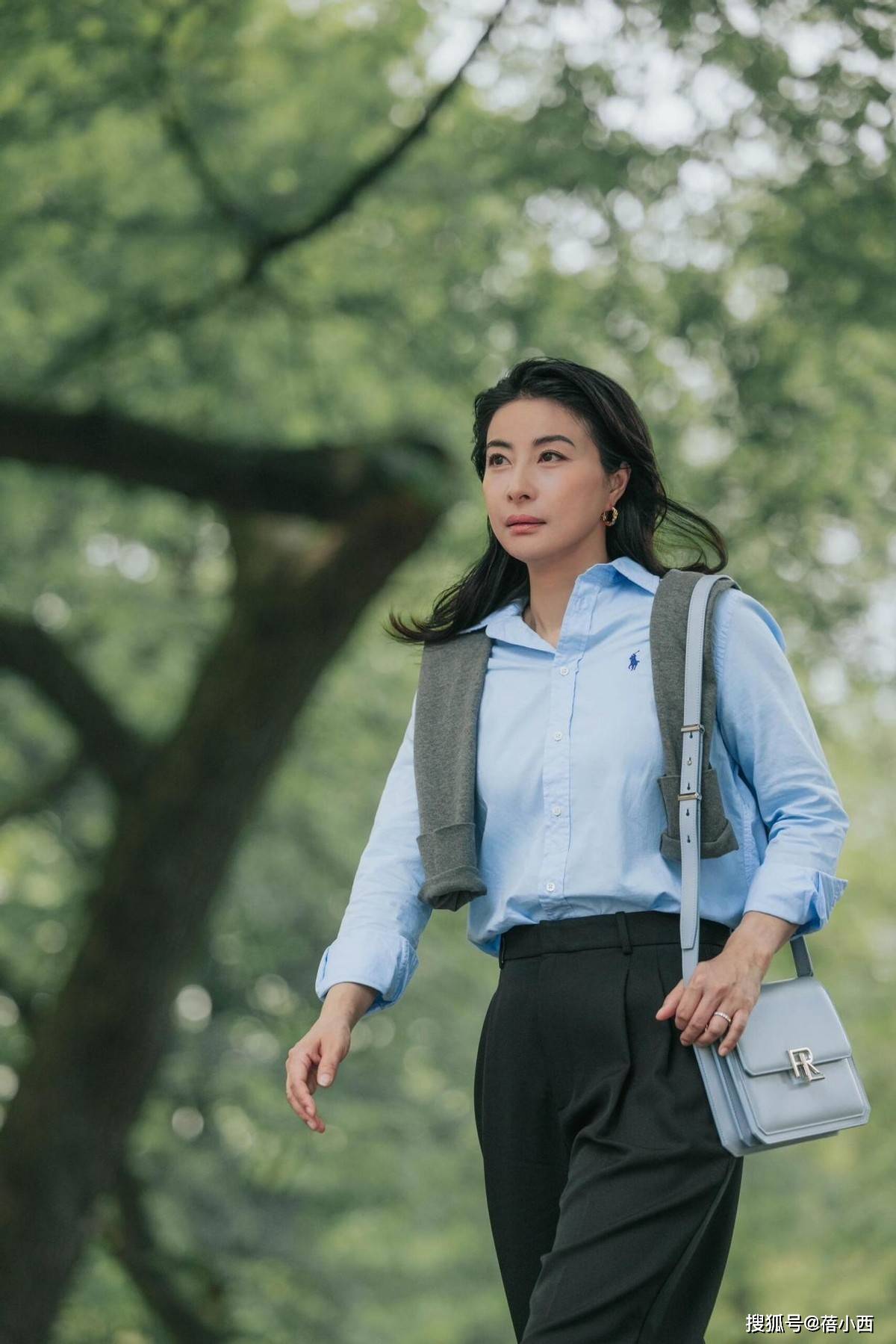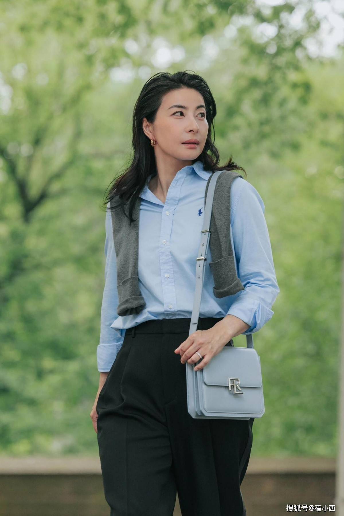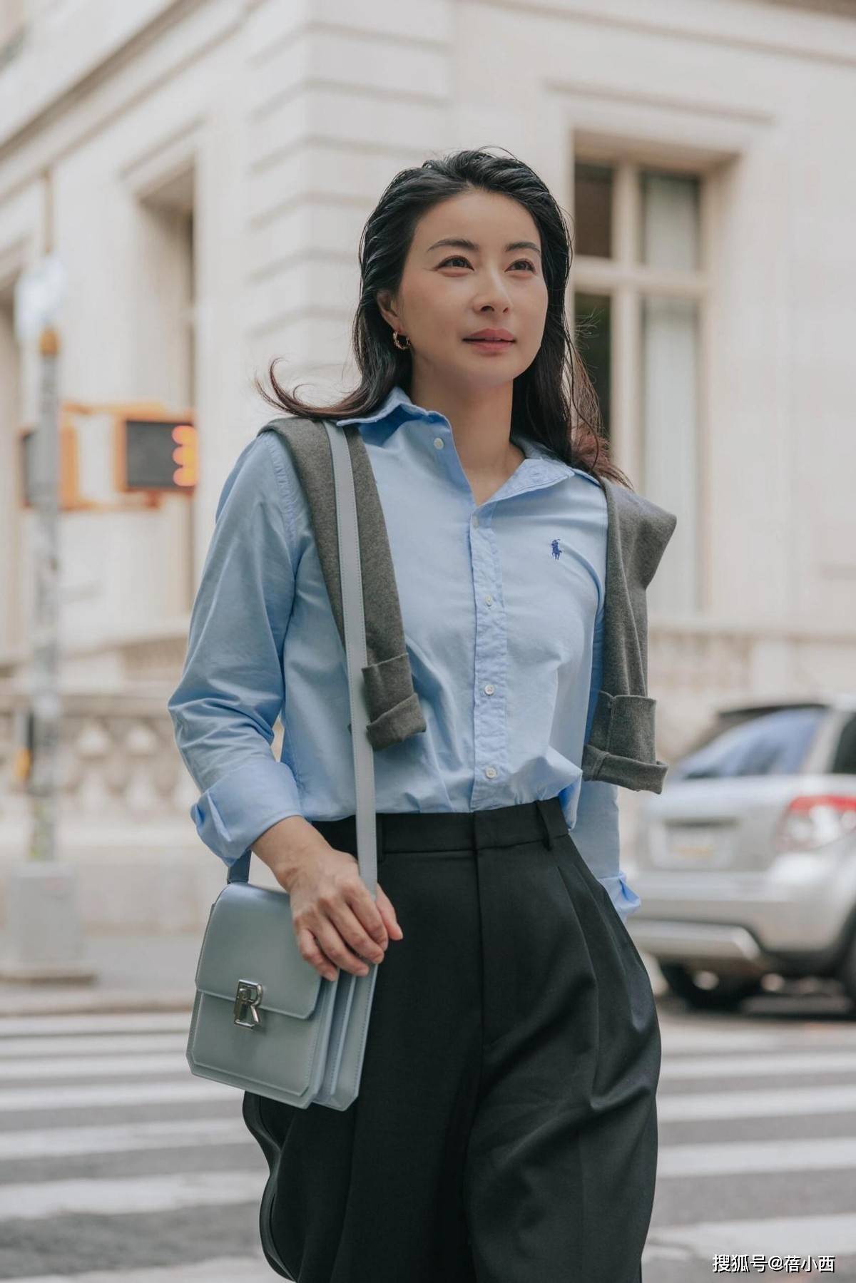 如果下半身较瘦,又希望穿出成熟感,可以尝试白色阔腿裤。蓝色衬衫搭配白色阔腿裤,宛如奶油般柔和清爽,十分大气。搭配灰蓝色的低调包包,不仅实用(可以装手机和日常用品),也能轻松驾驭衬衫或小裙子👗,洋气且不过于受年龄限制。唯一稍有不足的是发型,『郭晶晶』的短发如果能够更蓬松轻盈,会更契合她整体书香气息的造型,而不是过于油亮的效果。