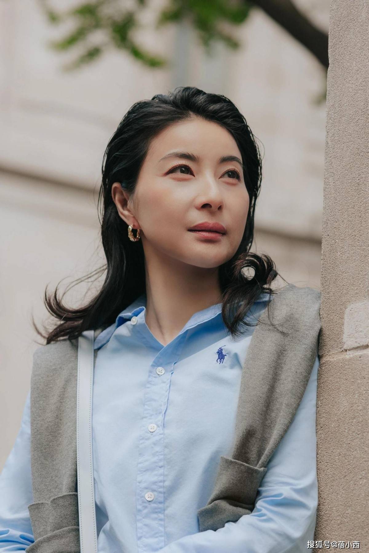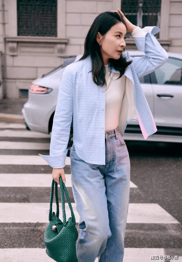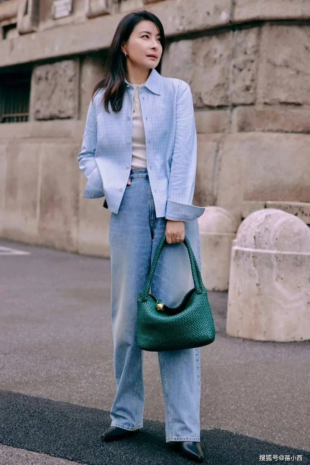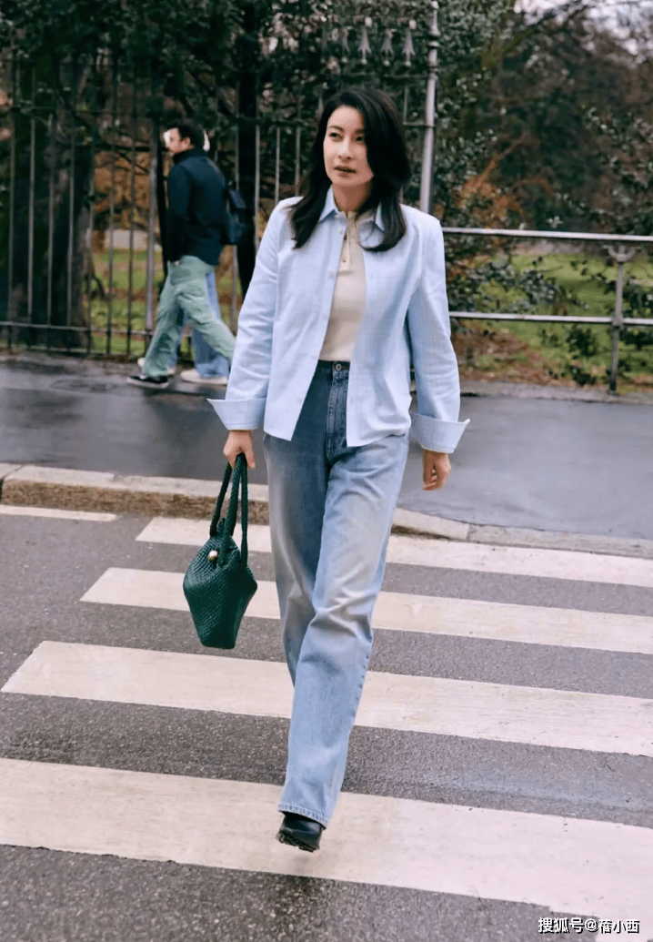 如果下半身较瘦,又希望穿出成熟感,可以尝试白色阔腿裤。蓝色衬衫搭配白色阔腿裤,宛如奶油般柔和清爽,十分大气。搭配灰蓝色的低调包包,不仅实用(可以装手机和日常用品),也能轻松驾驭衬衫或小裙子👗,洋气且不过于受年龄限制。唯一稍有不足的是发型,『郭晶晶』的短发如果能够更蓬松轻盈,会更契合她整体书香气息的造型,而不是过于油亮的效果。
