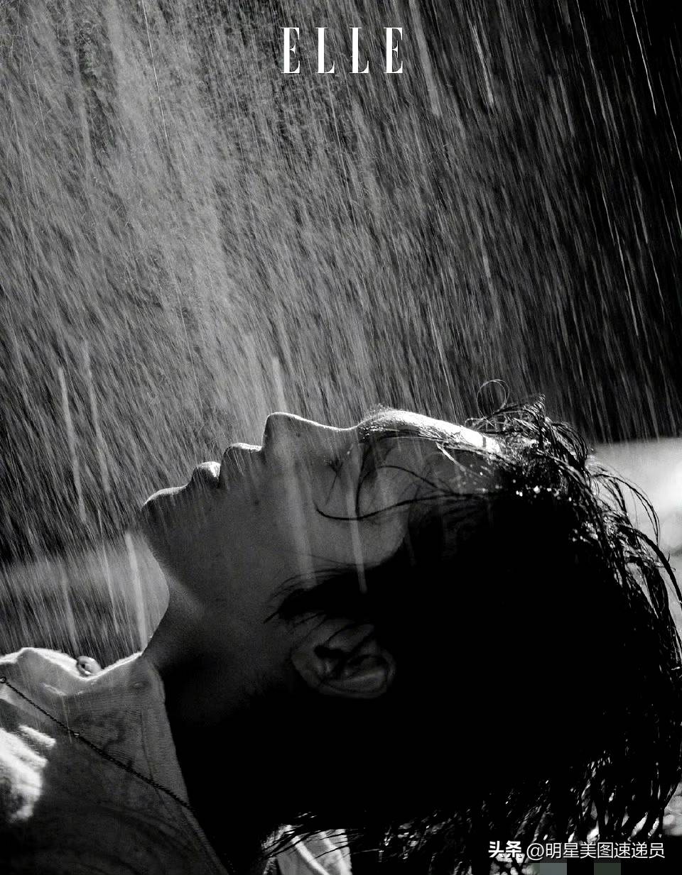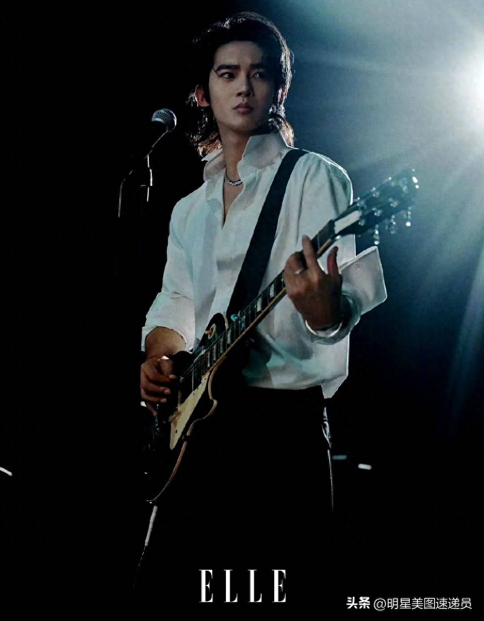 镜头中的他,宛如舞台上自信的摇滚主唱:白衬衫随意地垂落,宽松的领口勾画出他的锁骨,吉他斜跨在肩上,随着聚光灯撕裂黑暗的瞬间,那种既松弛又野性的气质扑面而来。黑白色调的画面里,他的湿发紧贴脖颈,仰头面对如雨幕般的光影,这一刻的情绪张力仿佛被永久定格在胶片之中。