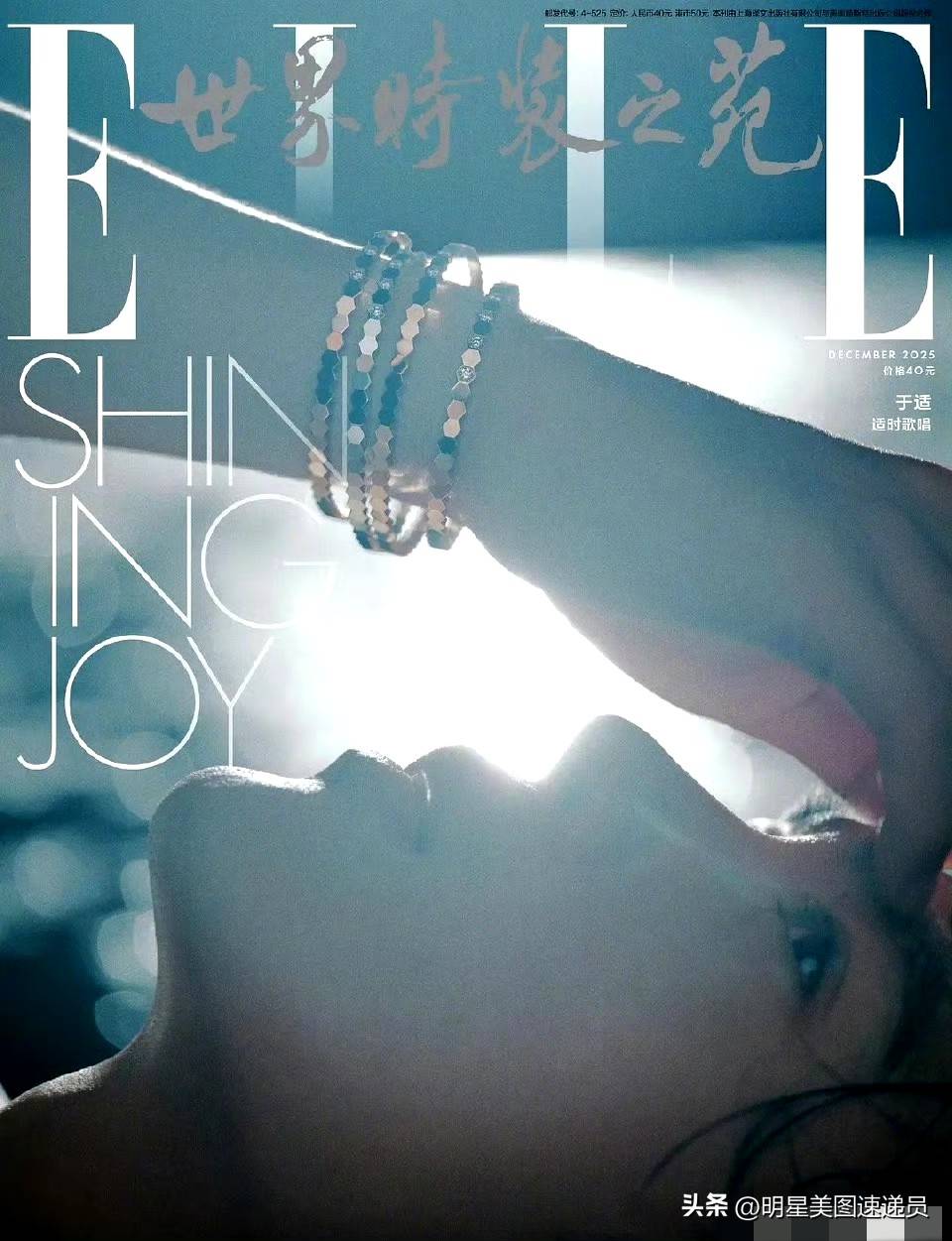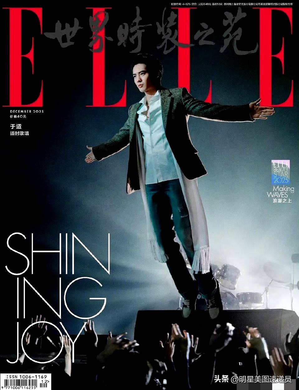 封面更是别具一格:他站在舞台的高台上,背后是举起的粉丝手臂,西装外套🧥的下摆如披风般飞扬,“SHINING JOY”字样与光影交织,宛如演唱会安可环节的经典瞬间。连细节也不放过——手链叠戴,灯光下散发着微弱的光泽,就像是舞台上的精致“细节杀”,被镜头巧妙捕捉。