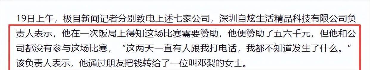赞助商还说,这些钱都转给了邓梨,他们自己没插手赛事安排,也不清楚比赛的具体细节。