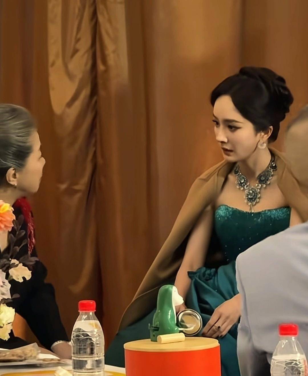 红毯结束后,演员们在后台休息,三三两两地聊天。『杨幂』和欧豪等人坐在一起,看到迟蓬走过来,『杨幂』连忙挥手,示意她坐到对面。