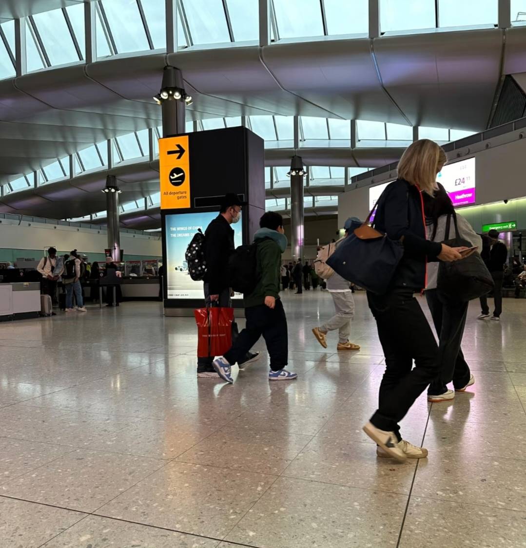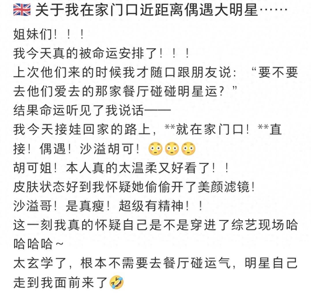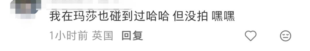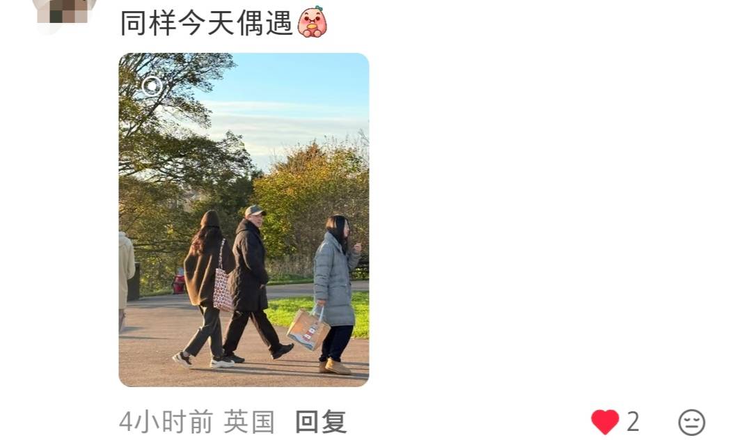 从网友的描述来看,他们是在当日下午四点左右被偶遇的。评论区里有来自英国的网友也表示曾遇到过他们,其中一位还分享了拍摄的照片。仔细观察,照片中沙溢似乎察觉到有人在拍照,眼神定格在镜头前,而胡可则转头朝另一边看去。