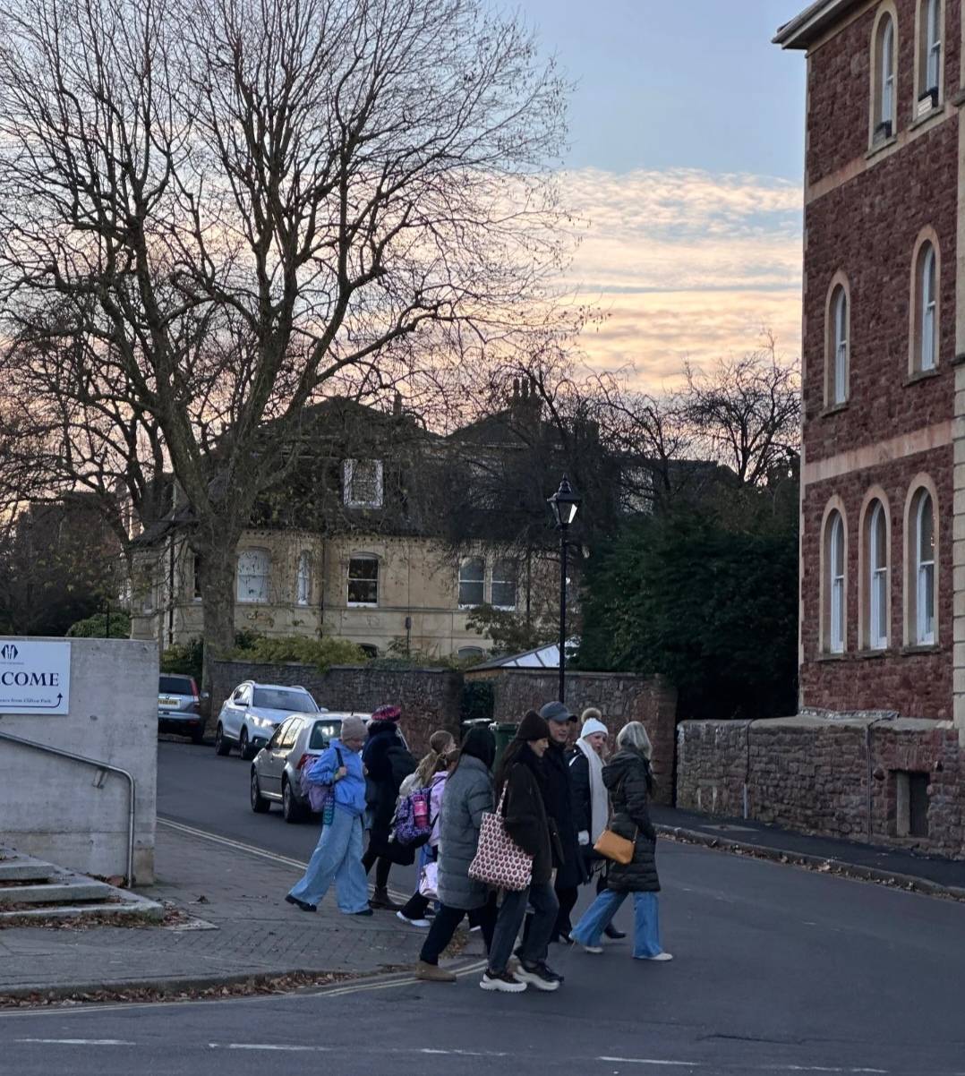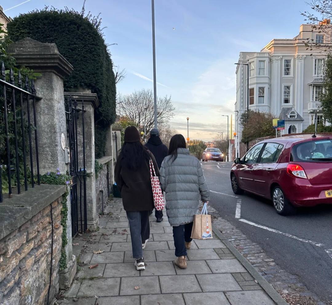 他们沿着街道漫步,一边是放学的孩子们和接送的家长。穿过马路时,两人露出侧脸,皮肤白皙,丝毫不逊色于周围的人。背景是水泥街道、高耸的建筑和茂盛的大树,天空中残留着些许金黄色的云彩。两人谈笑风生,看起来岁月静好,温馨和谐。