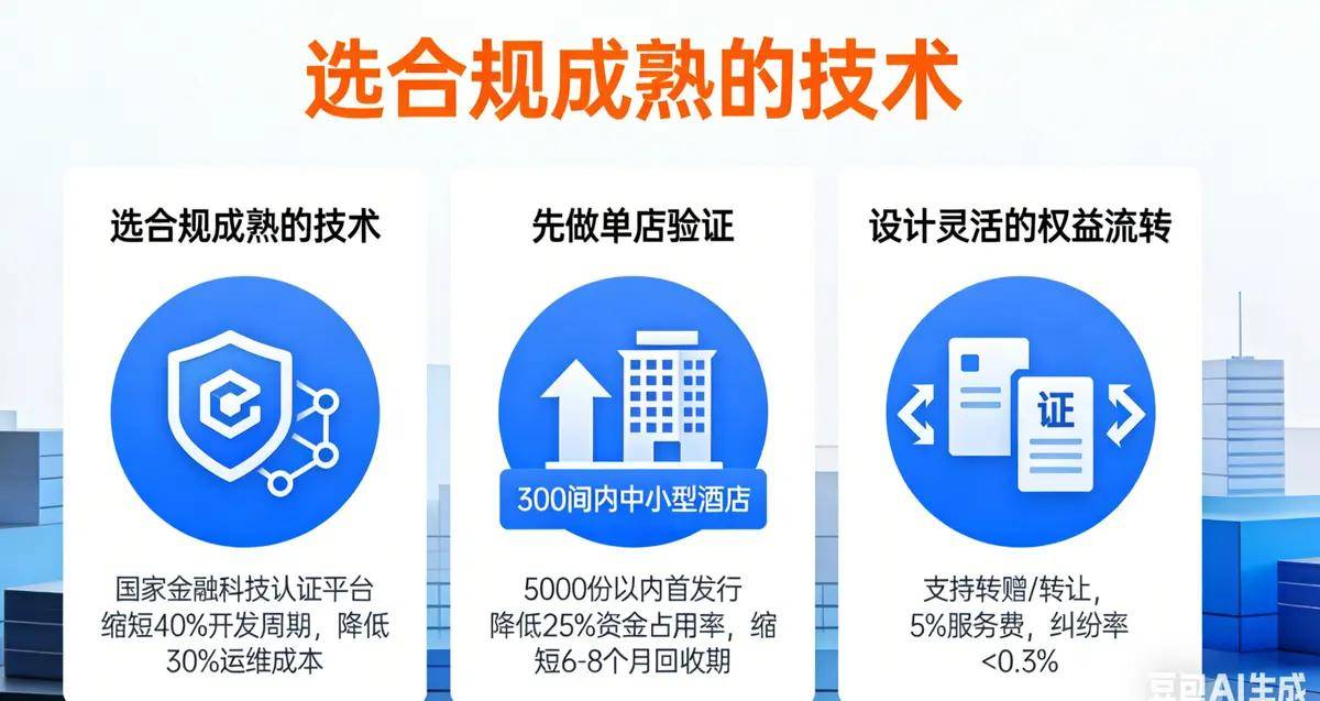 先做单店验证:初期别贪大,按“单点突破-区域复制-全国推广”来,先找300间客房以内的中小型酒店合作,首次发行权益控制在5000份以内,每份定价1000元左右。深圳那家酒店就是先发行5000份验证模式,再扩到20000份,这样能降低25%资金占用率,缩短6-8个月投资回收期;