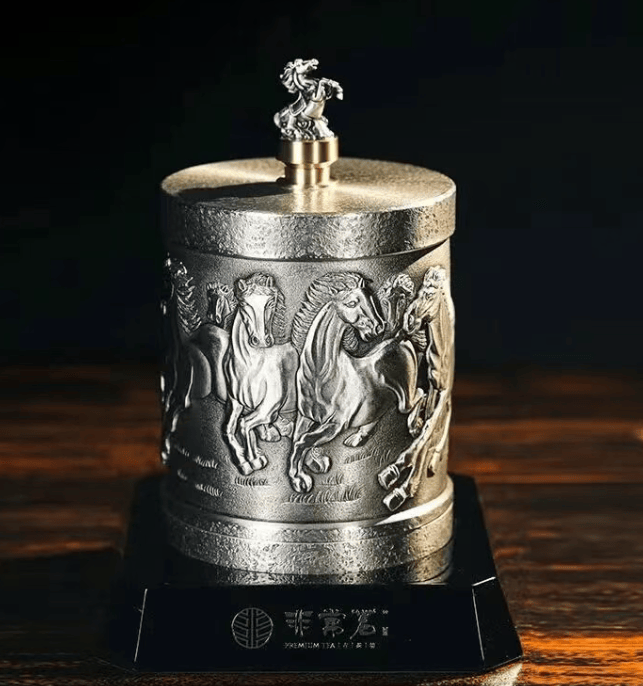 设计上直击长辈喜好,罐身浮雕“八骏图”,线条流畅有力,寓意“事业腾飞”“马到成功”,马年送马罐,祝福寓意格外贴切。搭配高档礼盒包装,开箱仪式感拉满,设计寓意20分满分。