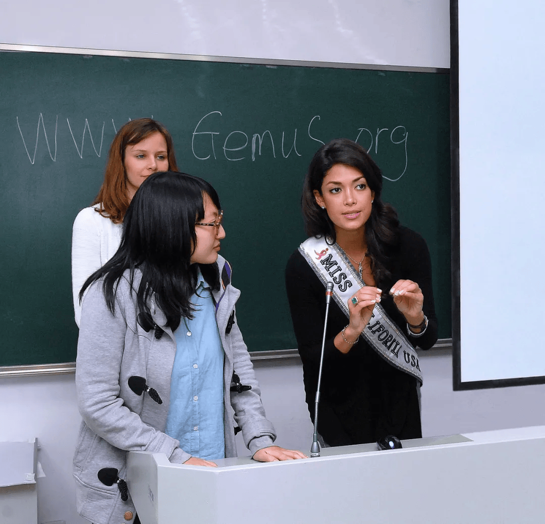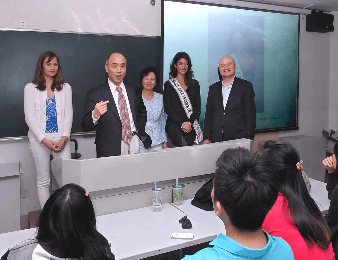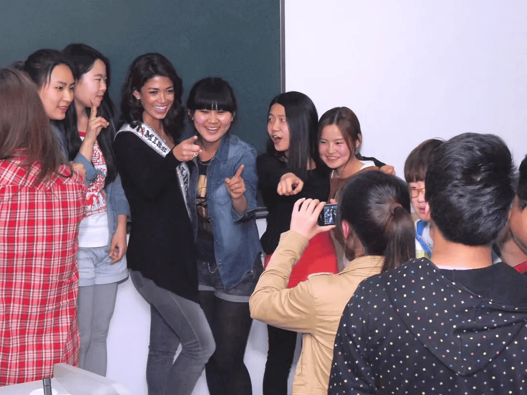 五月的上海,正是风光最好的时节。和煦春风携着明媚暖阳,也将这位特殊的嘉宾送到了他们身边。妮可抵达上海后的第二天上午,George Shen驱车带她前往复旦大学上海视觉艺术学院。当她身披 “加州小姐” 绶带走进教室的那一刻,同学们立刻报以雷鸣般的掌声。眼前热情又礼貌的欢迎场面,让妮可喜出望外,她满面春风,频频颔首向大家致意。