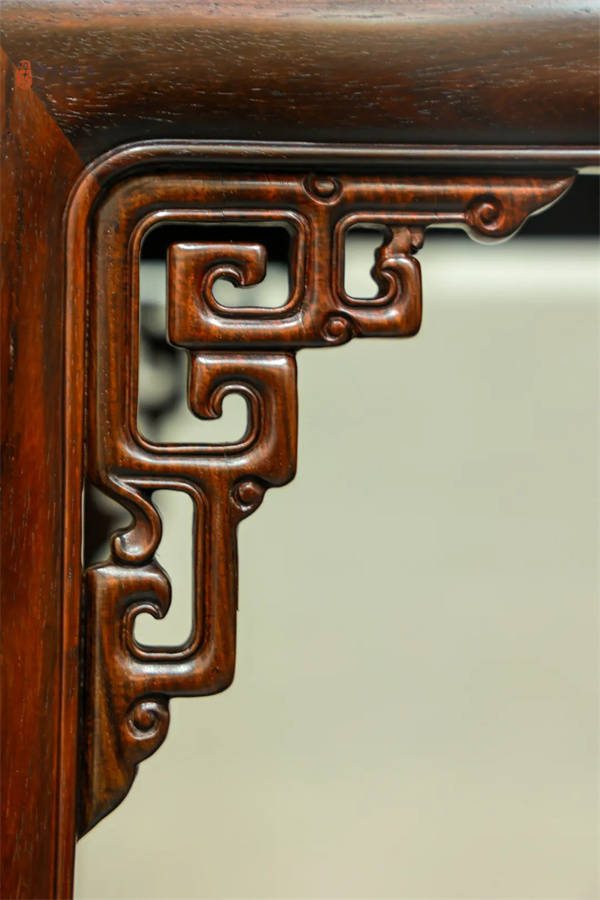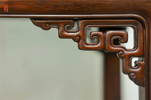 四方腿直立,腿间饰透雕拐子纹角花,盘曲柔婉;下端安管脚枨,枨与腿两侧做阳线交圈,且饰以卷云纹角牙,每一处细节都彰显着匠人的精湛技艺。