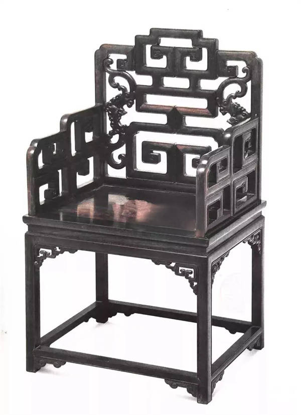 此椅靠背的寿纹与扶手的回纹运用了传统家具中的重要工艺手法——攒接。