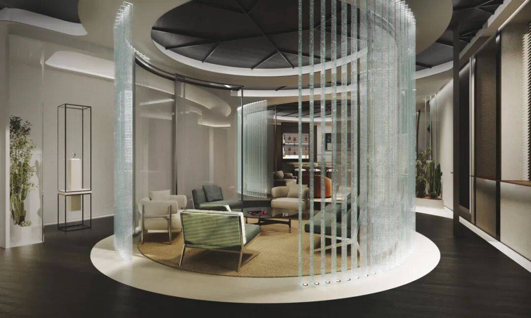 这间270平方米的店面依例拥有贯穿全球所有RICHARD MILLE精品店的“碎玻璃”鳍片元素,在划分功能区的同时维系了视觉的通透感,构建出兼具空间流动性与私密氛围的开放格局。