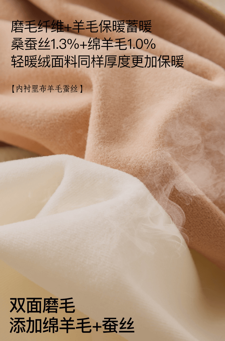 它的里料是实打实的绵羊毛+桑蚕丝混纺,大家都知道羊毛保暖,蚕丝亲肤,这两者结合,简直就是黄金保暖CP!