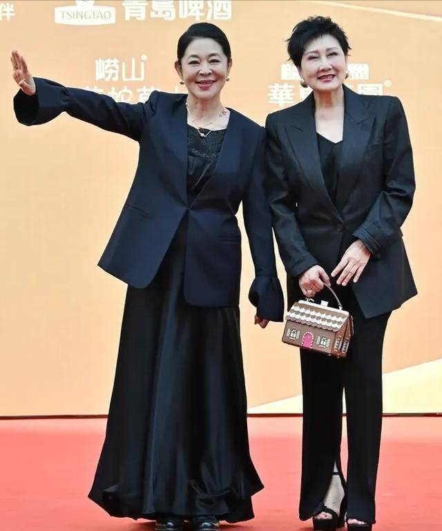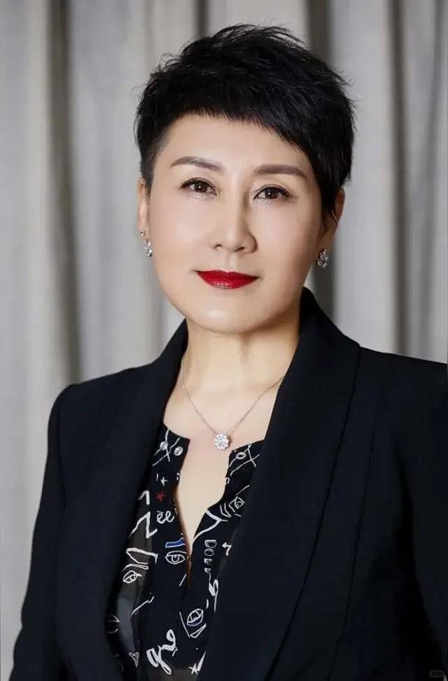 她与倪萍携手亮相青岛,身着黑色西装套装,内搭简约打底衫,干练短发凸显飒爽英姿。