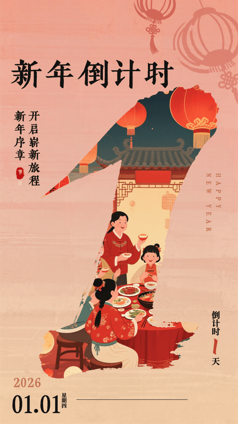 这组跨年海报模板,用中式团圆元素强化新年情感共鸣,暖棕色调传递温馨质感,数字“1”的镂空设计融入场景,让2026倒计时海报分享既有仪式感又具文化温度。