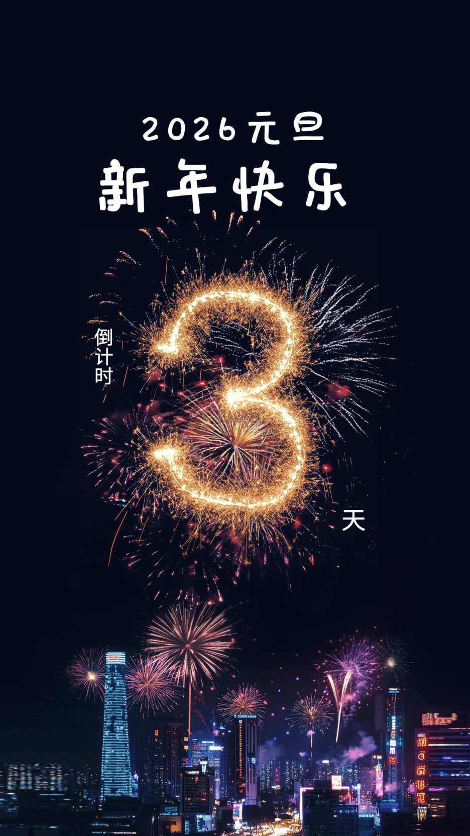 一、都市烟火风跨年海报模板这组跨年海报模板,以暗黑城市夜景为背景,搭配烟花组成的数字“3”,突出 跨年倒计时、新年倒计时、2026倒计时海报分享主题,适配城市商圈、线下活动的跨年盛典倒计时宣传场景。