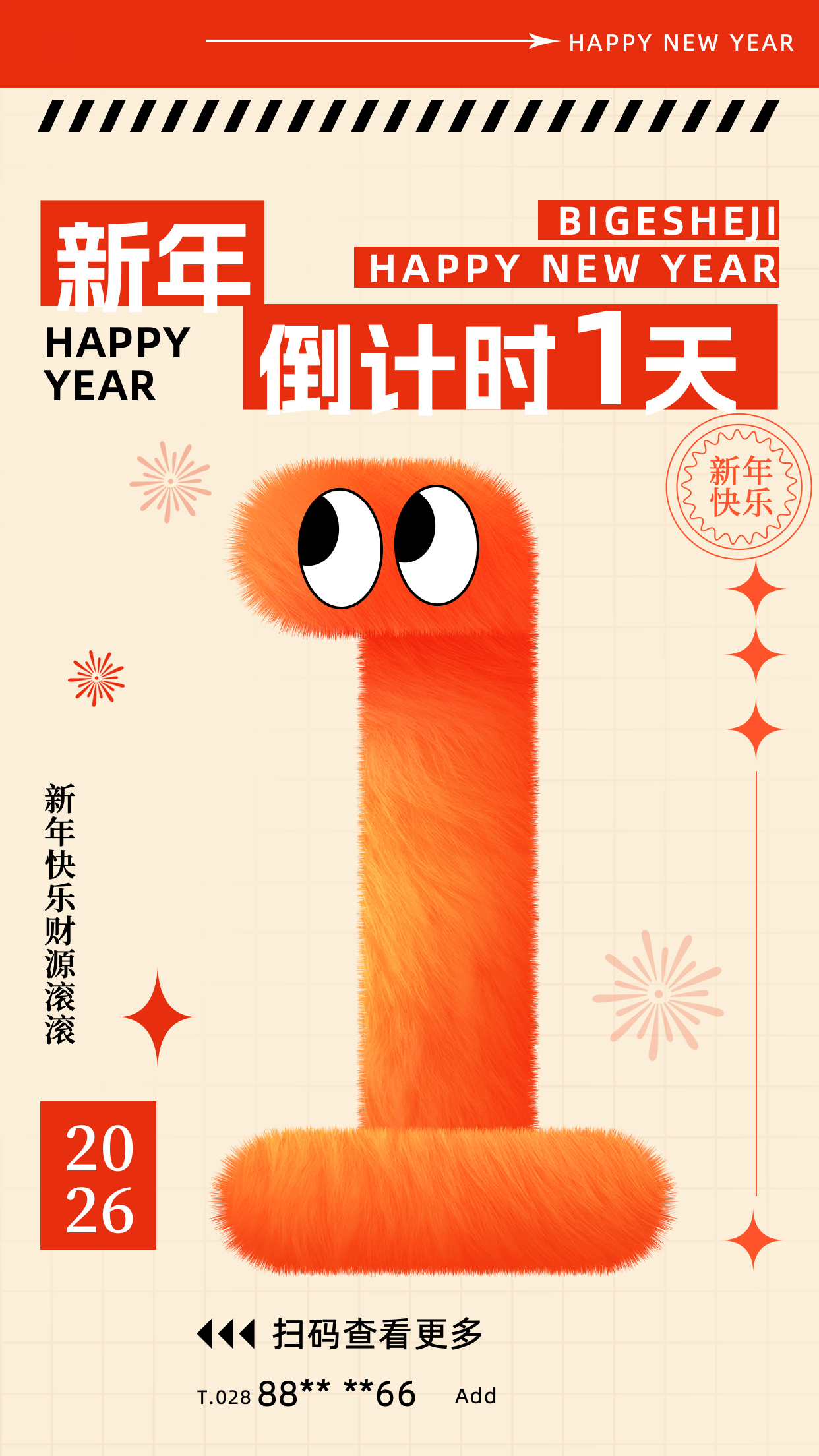 这组跨年海报模板,以浅黄网格为背景,结合毛绒质感的拟人数字“1”,突出新年倒计时海报主题,搭配“新年快乐财源滚滚”的轻松文案,适配年轻群体、潮流品牌的『社交平台』倒计时宣传场景。