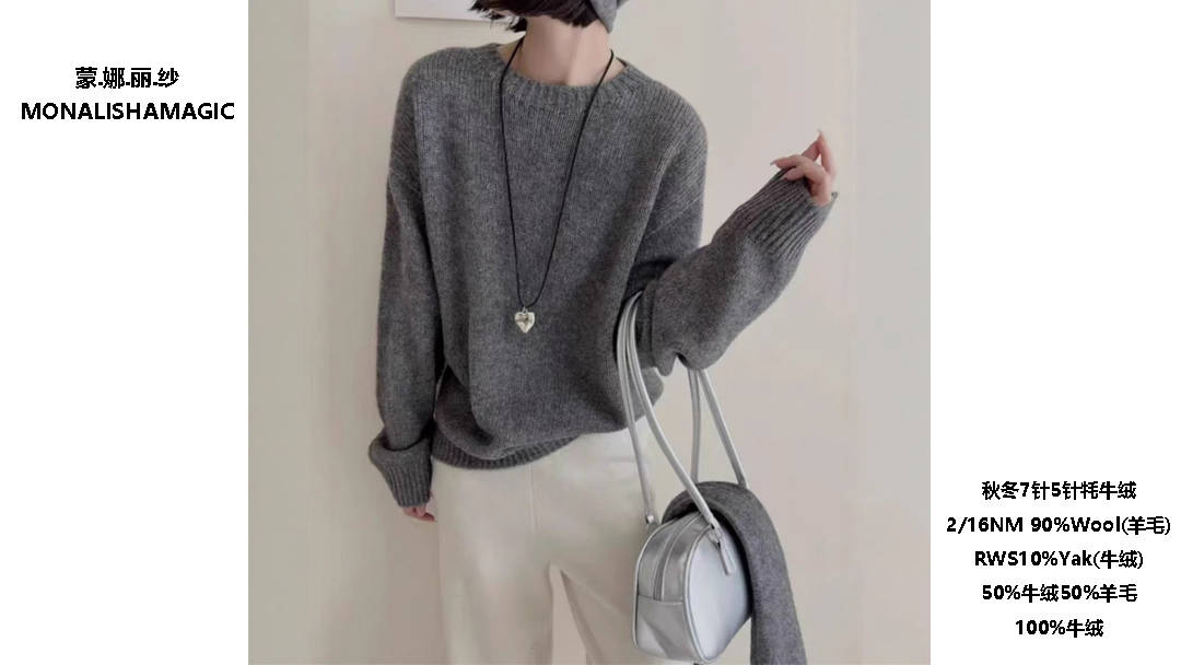 90%羊毛 + 10%牦牛绒:这种配比适合大众高端市场,常见于基础款『针织衫』、打底衫、围巾🧣等产品。价格比纯羊毛产品高15 - 20%,性价比突出。其核心卖点是在羊毛舒适的基础上增加绒感,提升了基础款的附加值,目标客群是注重品质与价值平衡的成熟消费者。