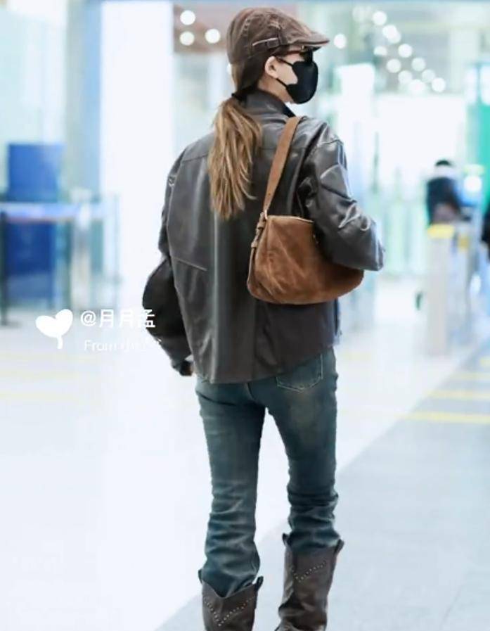 她下身穿了一条深蓝色紧身牛仔裤👖,裤型本身尚可,但搭配的那双黑色皮靴却让人有些费解。靴子的筒身过于宽大,鞋头也显得圆钝,看上去不仅笨重,还略带廉价感。更引人注意的是她的走路姿势,明显的内八字,配合这双宽大的靴子,每一步都显得有些不协调。
