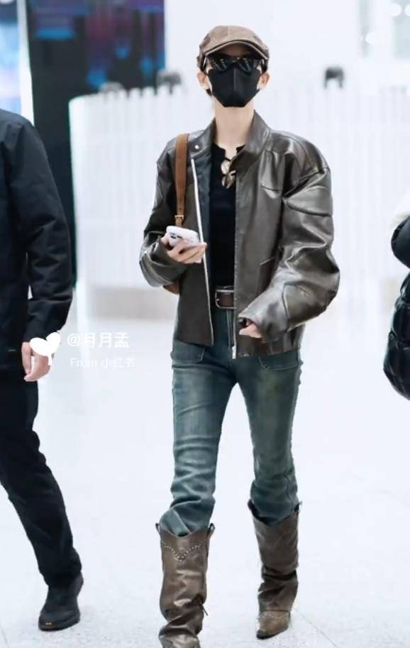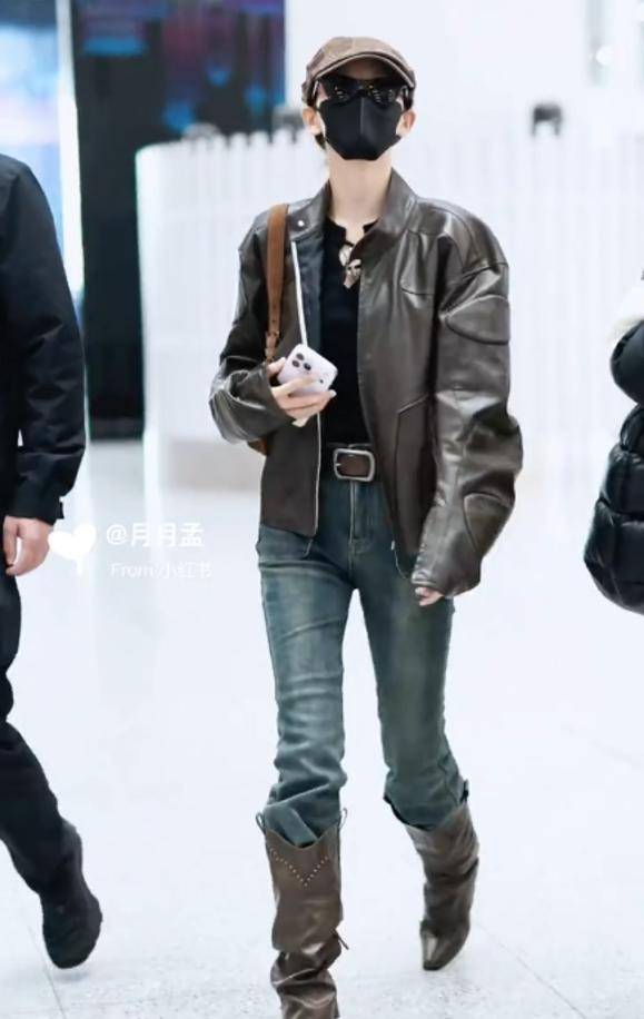 她上半身穿了一件黑色镂空内搭,领口的设计巧妙露出漂亮的锁骨线条,含蓄而不张扬。外搭一件短款黑色皮衣,袖口随意散开,衬得手腕愈发纤细。这身搭配完美勾勒出她清瘦修长的身形,腰肢盈盈一握。远远望去,身姿挺拔,步履生风,确实有种电影中女特工执行任务般的冷飒感。