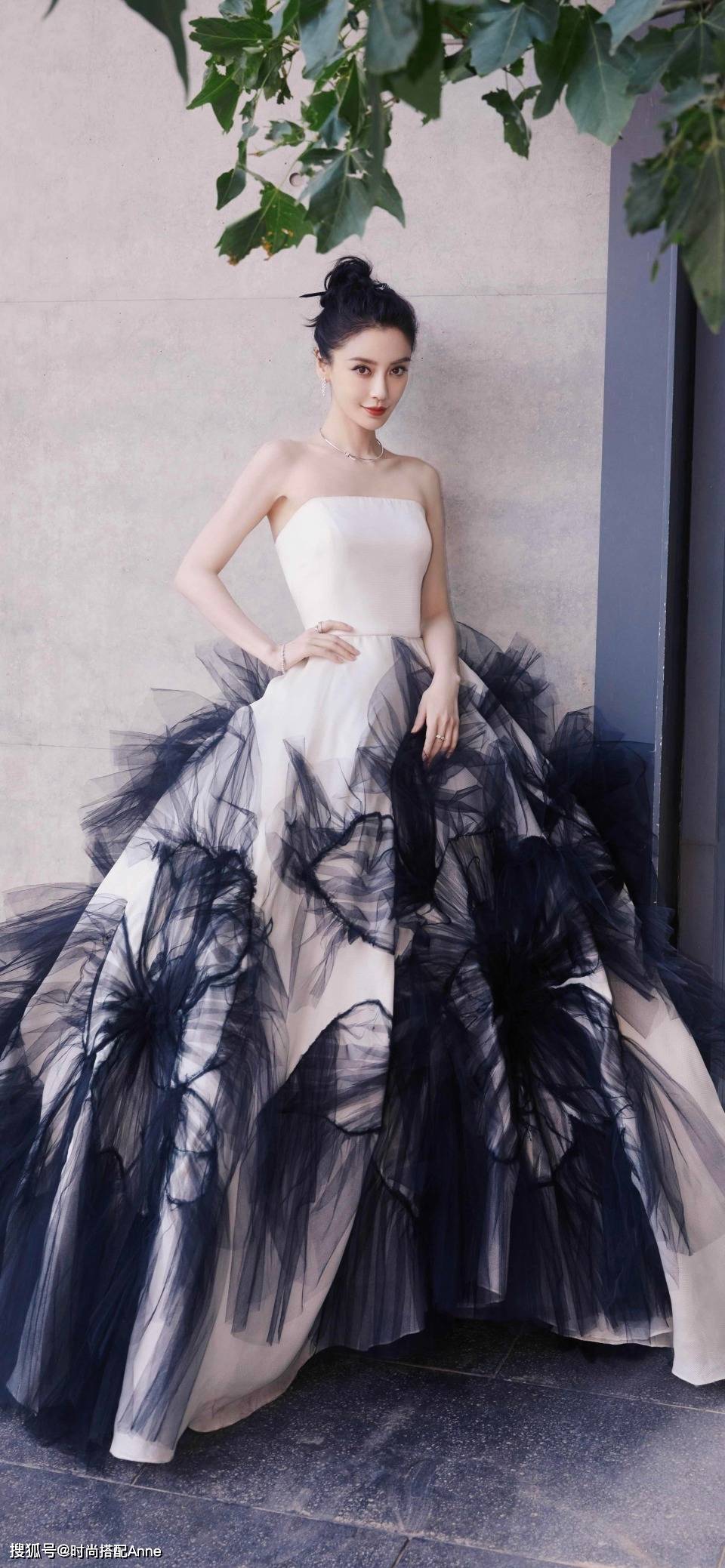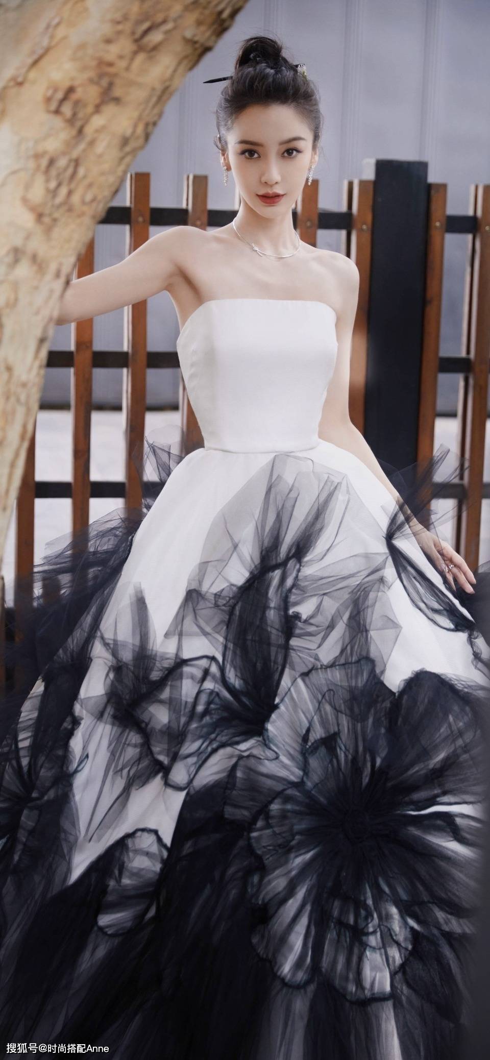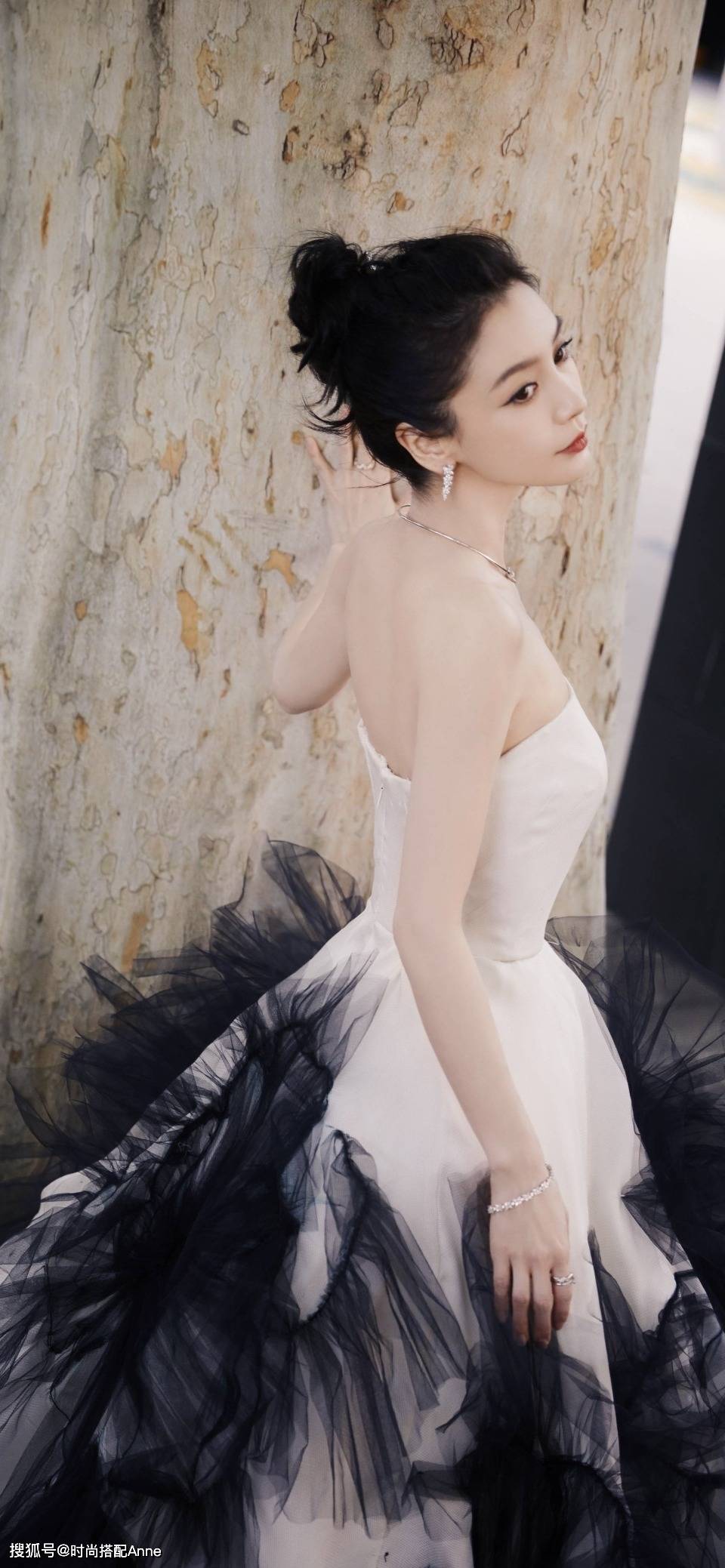 树脚,杨颖侧身而立,仿佛从一幅现代水墨画中走出的仙子。她身着的那件设计感十足的抹胸礼服,成为整幅画面的焦点。上半身纯白抹胸设计简洁而精准,完美勾勒出她著名的直角肩与精致锁骨线条。裙摆是真正的艺术品——黑白网纱以花朵形态层层叠叠,黑色如墨迹般深邃,白色似云雾般轻盈,两种色彩与质感交织,构成一幅会呼吸的立体水墨画。