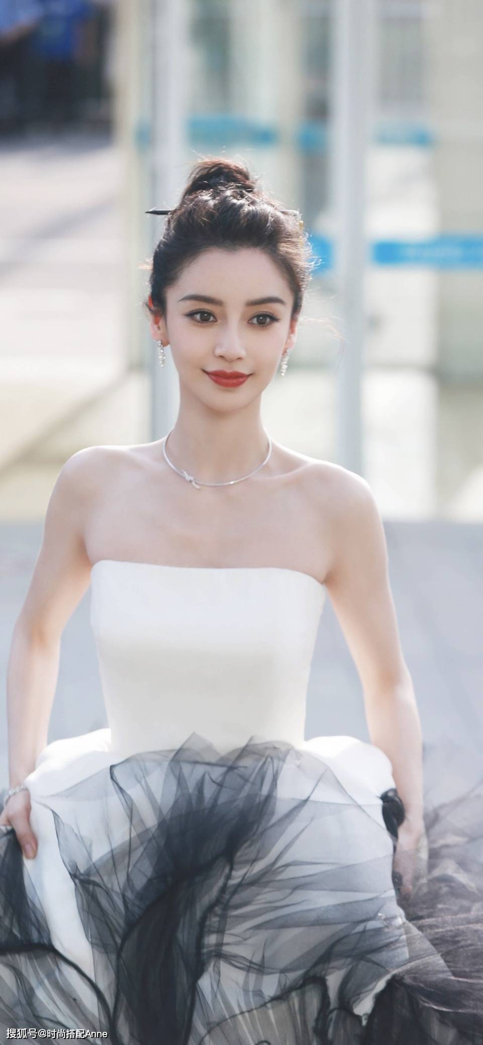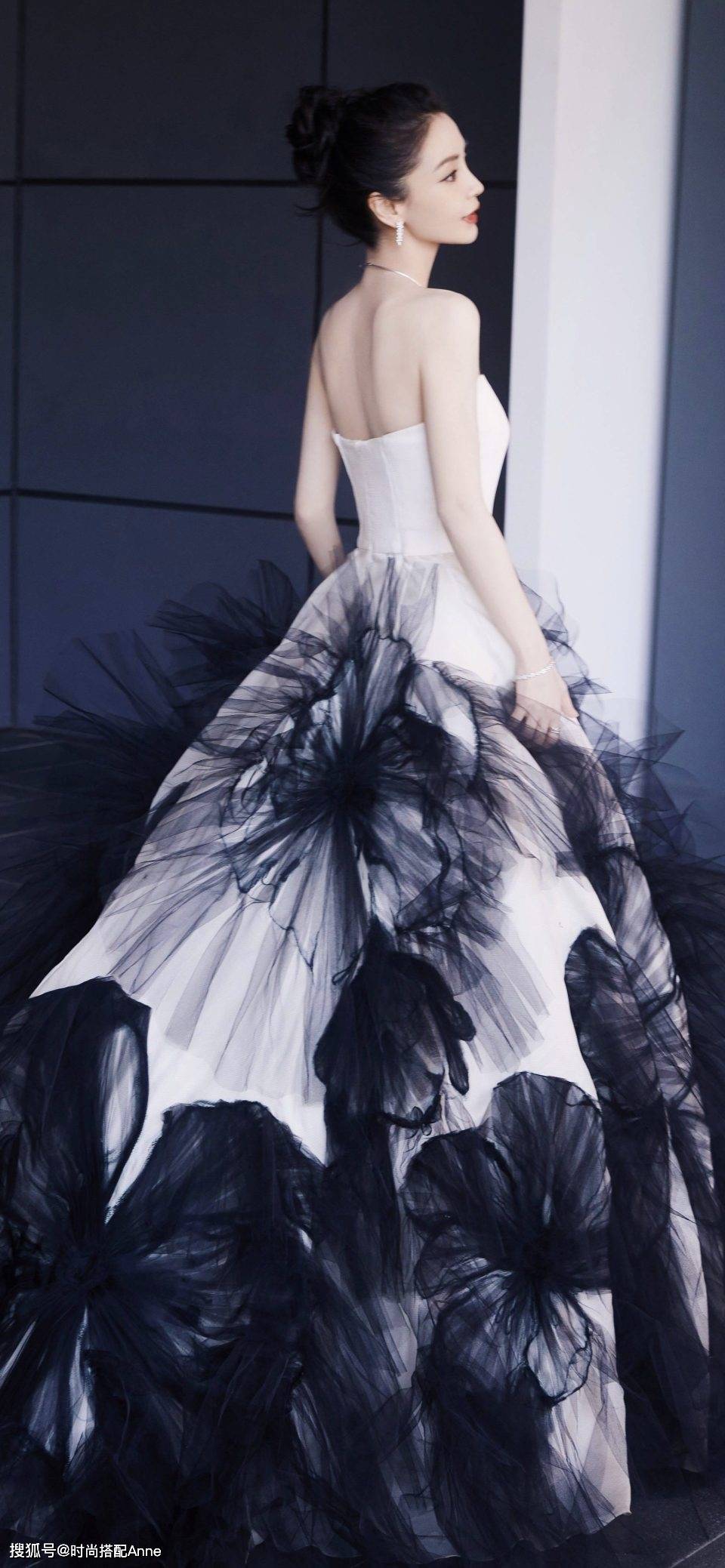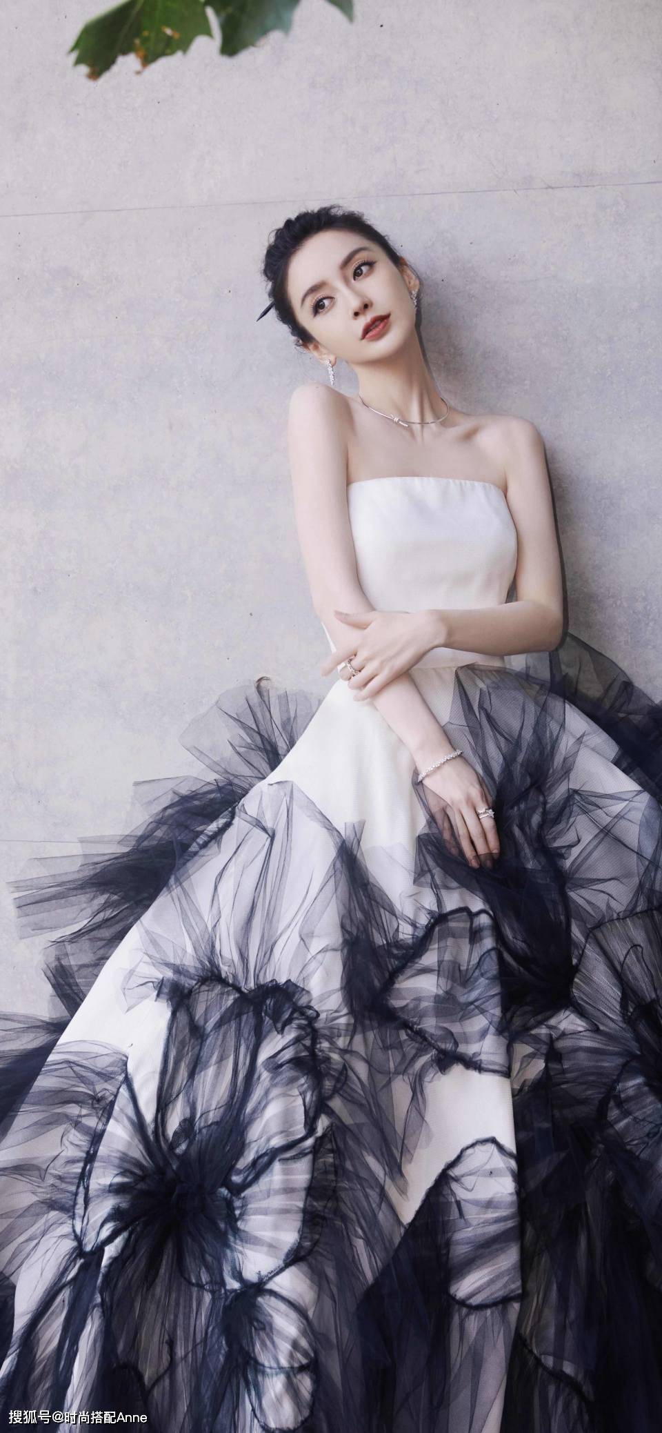 树脚,杨颖侧身而立,仿佛从一幅现代水墨画中走出的仙子。她身着的那件设计感十足的抹胸礼服,成为整幅画面的焦点。上半身纯白抹胸设计简洁而精准,完美勾勒出她著名的直角肩与精致锁骨线条。裙摆是真正的艺术品——黑白网纱以花朵形态层层叠叠,黑色如墨迹般深邃,白色似云雾般轻盈,两种色彩与质感交织,构成一幅会呼吸的立体水墨画。