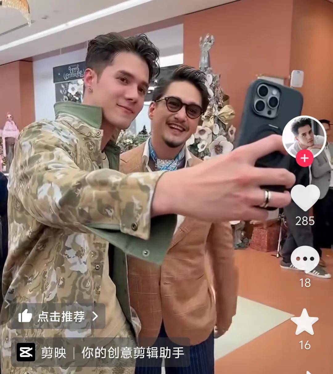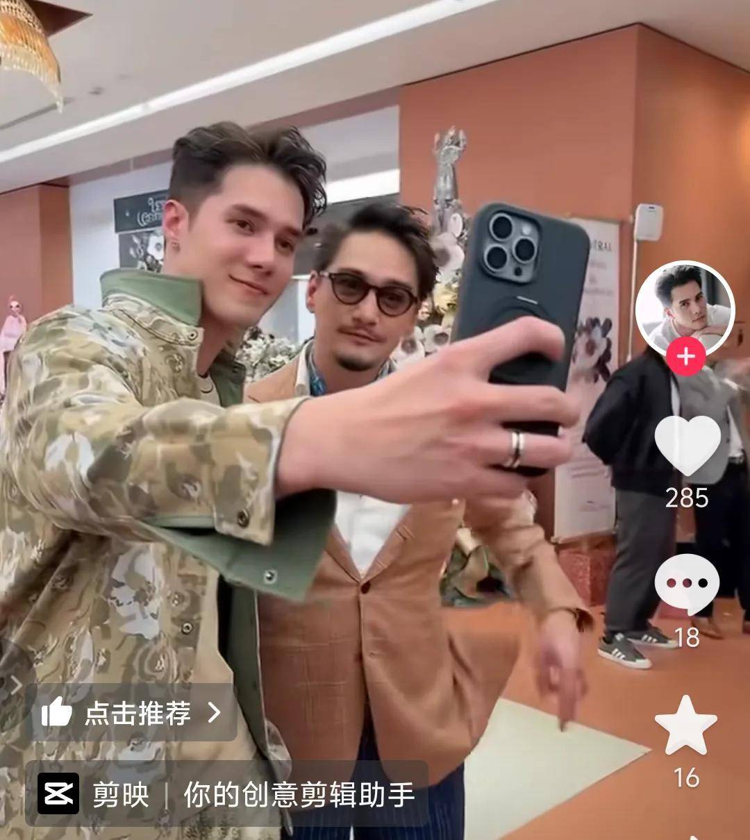 活动中,Mik惊喜遇见了自己的偶像——泰国资深演员“南叔”阿南达。他难掩兴奋,主动上前与偶像友好互动,并拿出手机记录下这珍贵时刻。南叔毫无前辈架子,不仅配合拍照,还对着镜头做出搞怪表情,身体随着节奏轻轻摇晃,尽显幽默随和的个人魅力。