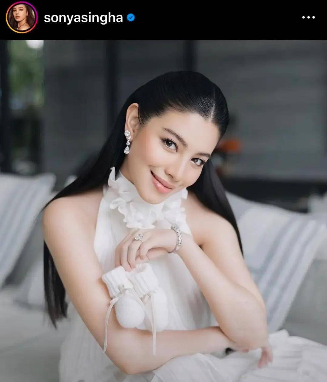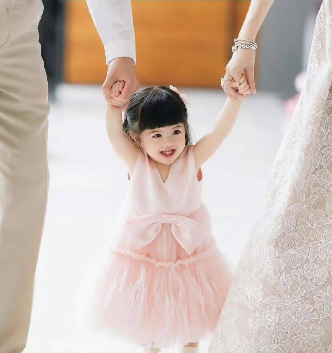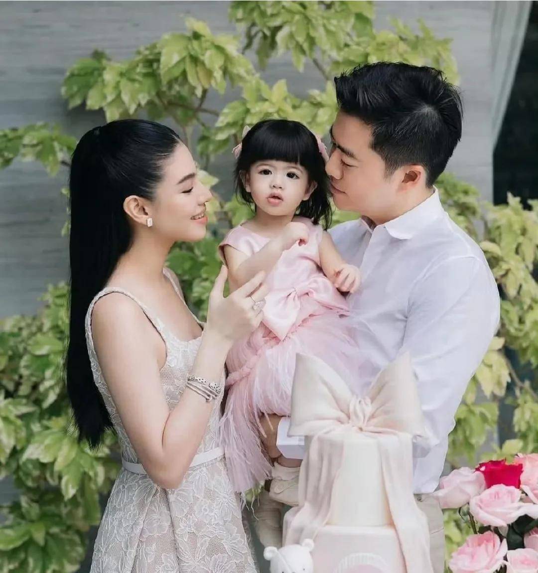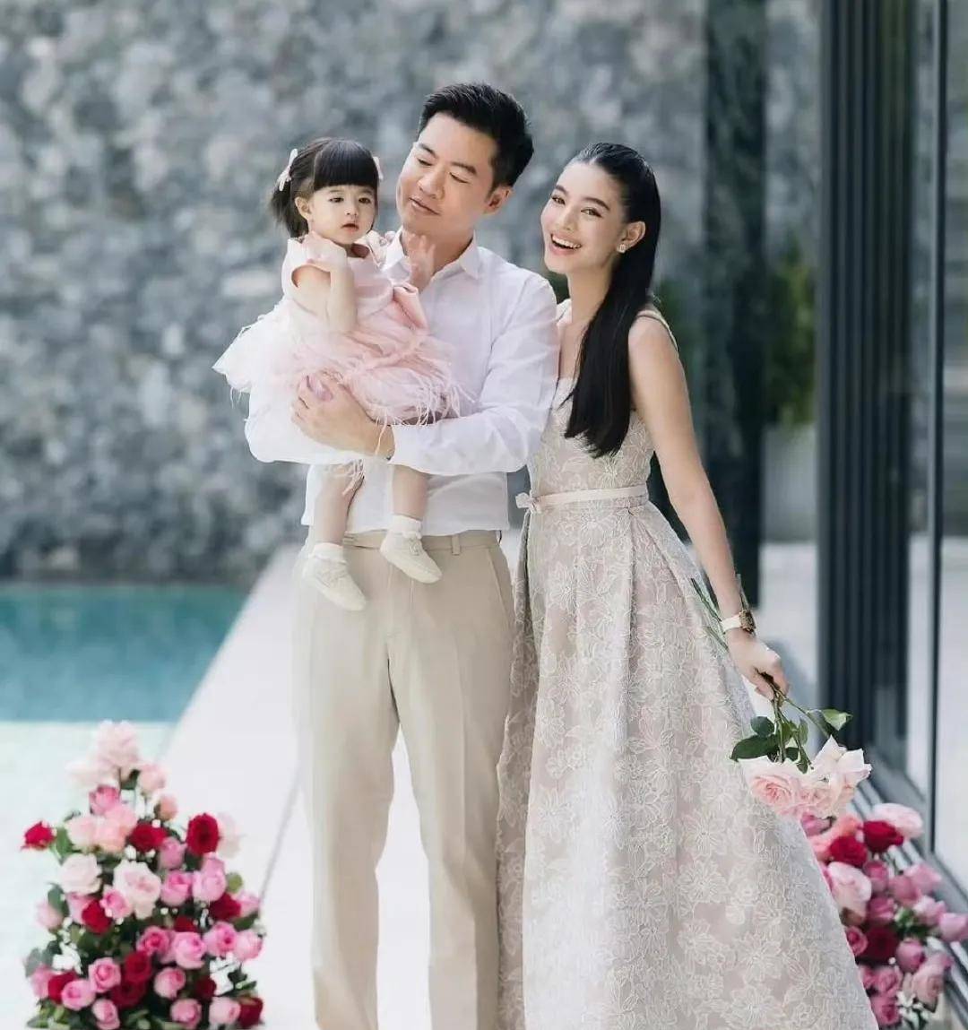 富商丈夫Hiso Kong则以一身清爽的白色衬衫搭配米白长裤亮相,简约而不失格调。小寿星Darin则被『打扮』成可爱的小公主,一袭粉色蓬蓬裙尽显娇憨。她拥有一头令人羡慕的乌黑浓密秀发,仿佛继承了泰国人普遍发量丰盈的优良基因。年仅一岁的Darin显然也遗传了妈妈肤白貌美的特质,五官精致如玉琢。