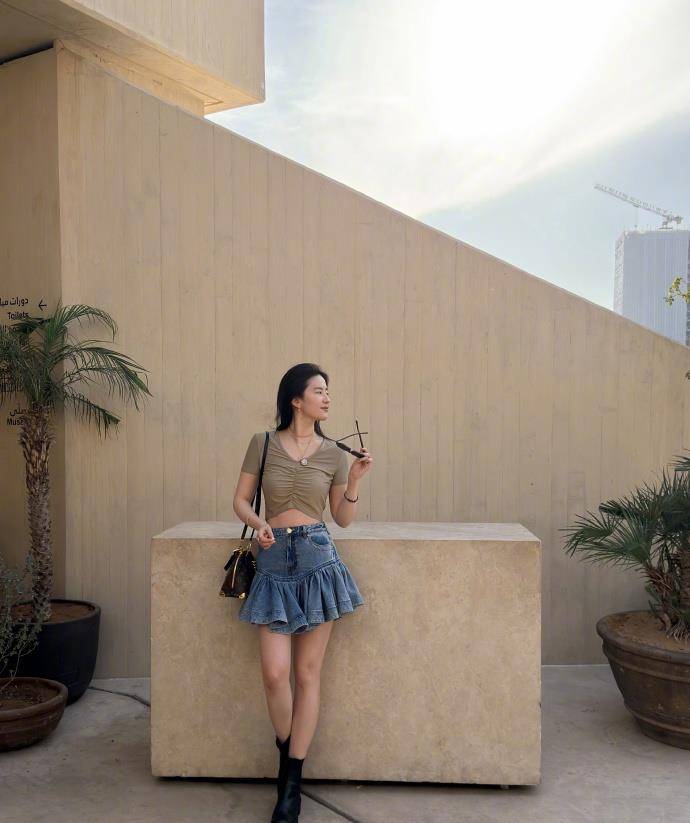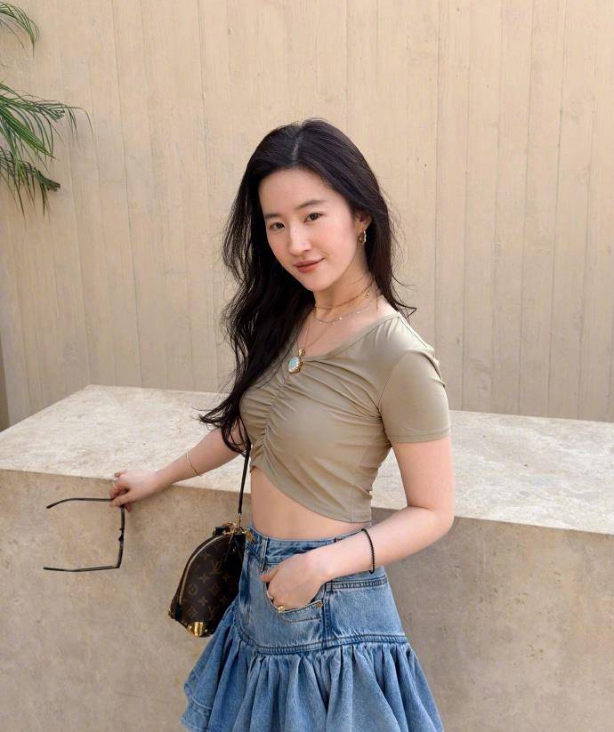 照片中,『刘亦菲』一袭『长发』,『妆容』清浅,仅以简约耳环点缀,洋溢着小清新气息。她身着露腰短袖上衣,搭配牛仔百褶裙,脚踩黑色短靴,一身装扮青春洋溢,靓丽夺目。