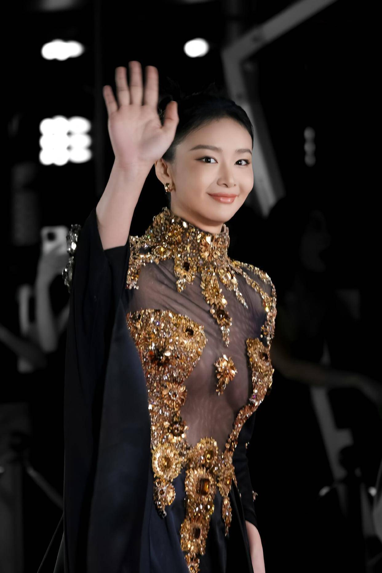这礼服设计绝了:黑透纱打底,金闪闪的珠子堆得跟浮雕似的,灯光下一晃眼,又闪又勾人,但高领长袖一罩,立马把 “露” 的尺度卡得刚刚好 —— 该遮的遮,该显的显,腰窝若隐若现,肩线干净利落,明明是透视装,却半点不廉价,全是 “我想露才露” 的松弛感,这哪是撑不住?这是把 “高级性感” 玩明白了!