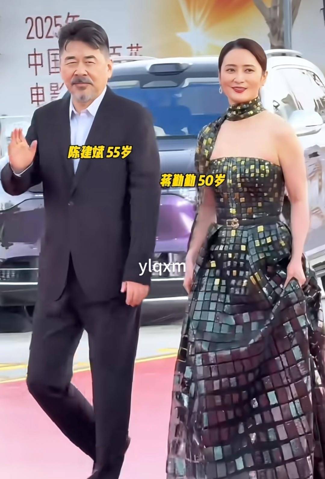 二人同框时,不少网友感叹:虽仅相差五岁,视觉上却颇有差距。陈建斌的络腮胡已见斑白,略显沧桑;而一旁的蒋勤勤则状态舒展,『妆容』得体,举手投足间尽显雍容气度,与年龄相符,更显自然。