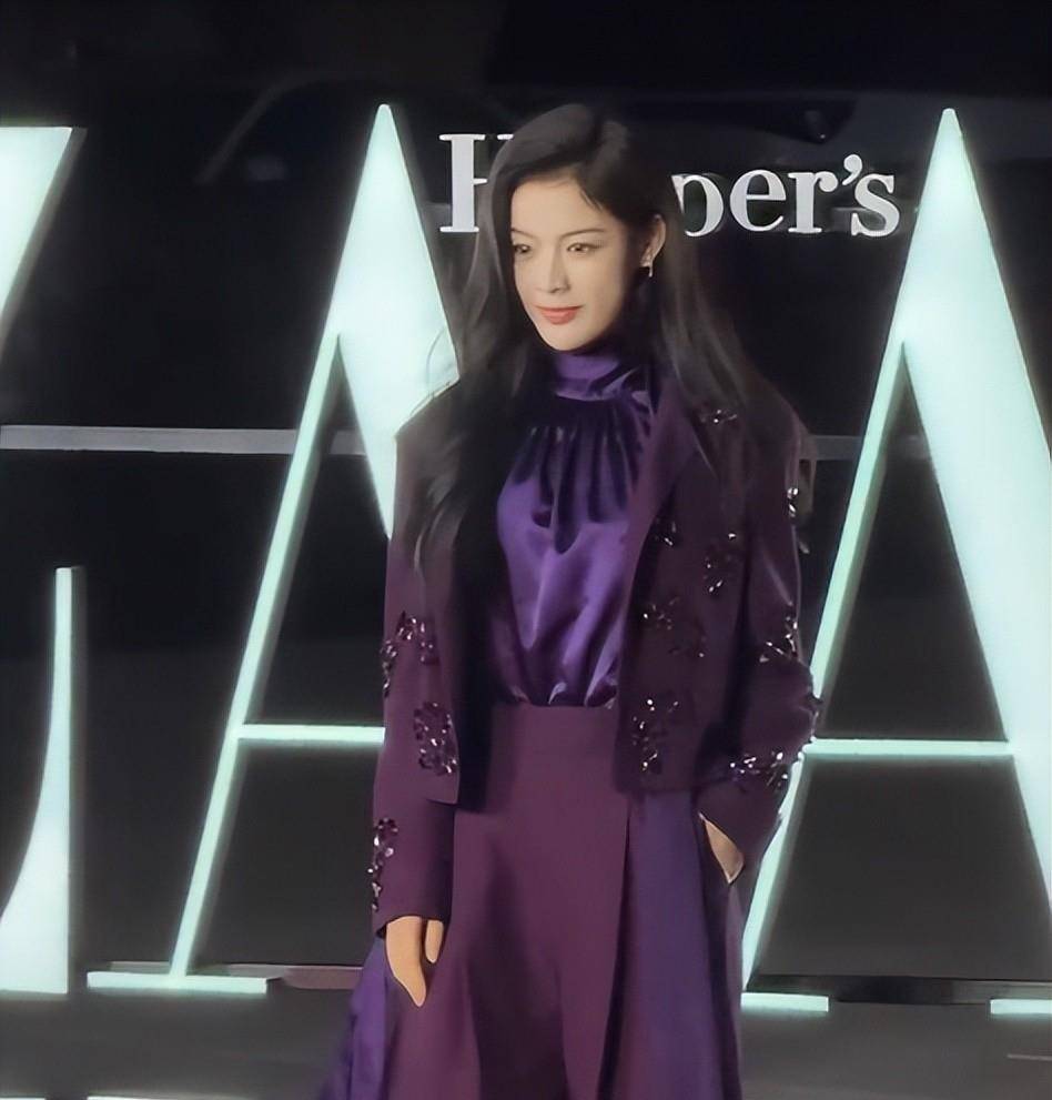 一袭紫色挂脖亮片礼服,配上利落短发与银色细长耳坠,是她全新的尝试。