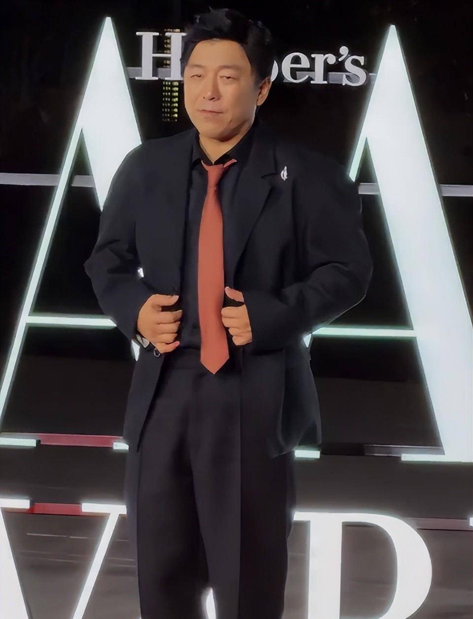 一套黑色丝绒西装,内搭黑衬衫与红色领结,非但没有修饰身材,反而放大了他的发福迹象,显得臃肿且比例失调,老气横生。