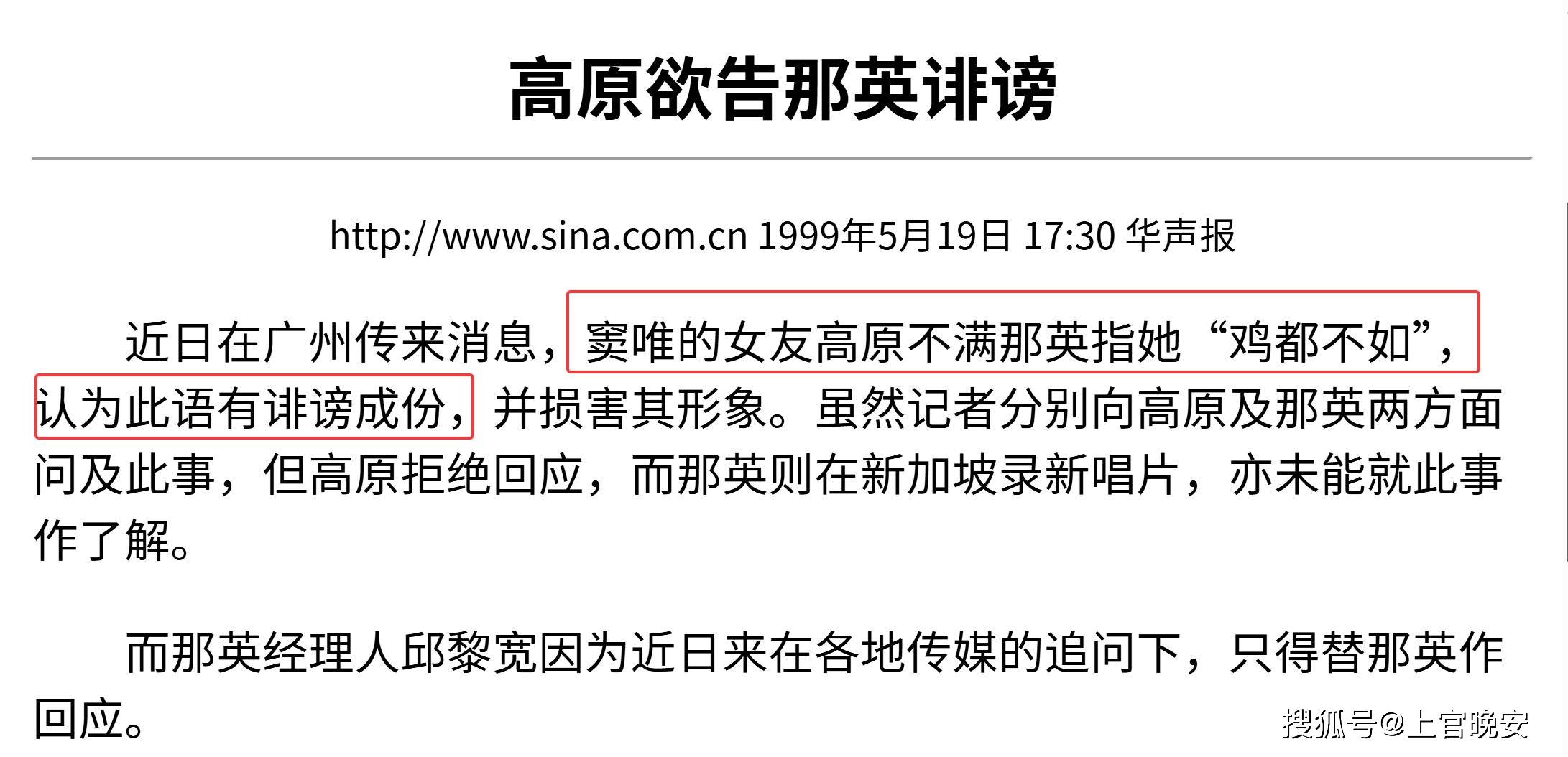 『王菲』和窦唯因为高原的介入而离婚,『那英』忍不住替好朋友抱不平,把高原骂得很难听,气得高原要告『那英』诽谤。
