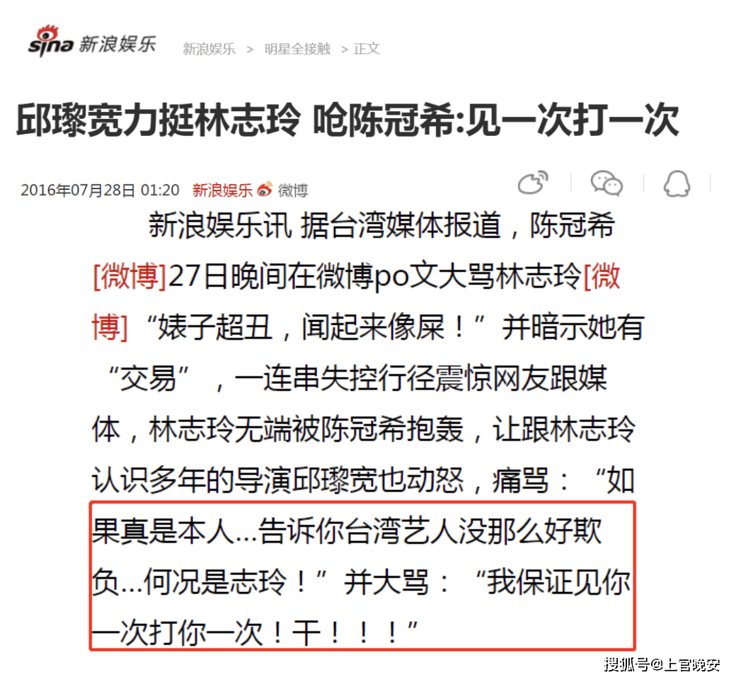 2016年,『陈冠希』炮轰『林志玲』,骂得要多难听有多难听,一时间『林志玲』被推上风口浪尖。没有一人为『林志玲』说话,又是邱黎宽第一个站出来力挺『林志玲』,并呛声『陈冠希』:见一次打一次。