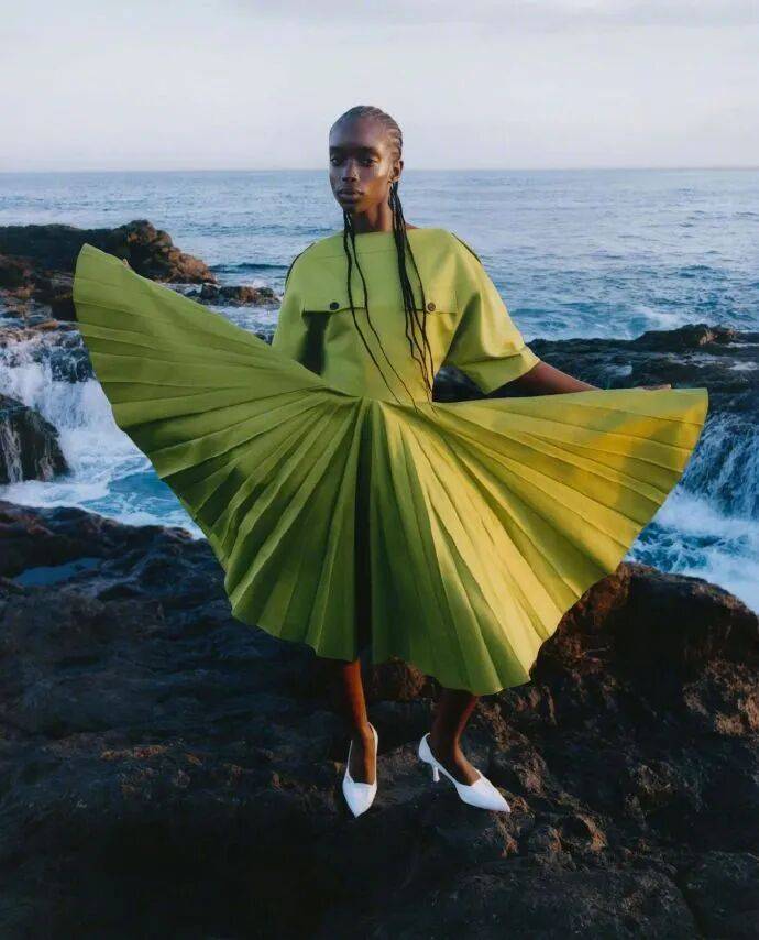 谁再说 “奢牌海边封 = 景与装的割裂堆衬”?看 Maty Fall 这波 『Vogue』 Germany 开年封 ——Gucci 的彩纹服饰顺着她的肩峰锐棱铺展,把 “奢牌的雅” 裹成 “骨相里的野”;海边的浪廓衬着她的轮廓张力,让 “海的荒” 衬着 “魂里的奢”;连掌心沙粒的细节都像 “骨相野的外延”,不是 “穿 Gucci 拍海景”,是她的力量感骨相,接住了 Gucci 的奢与海的野,把 “CELEBRATION” 主题从 “概念噱头” 拽成 “骨相、奢装与海野共振的呼吸感”。