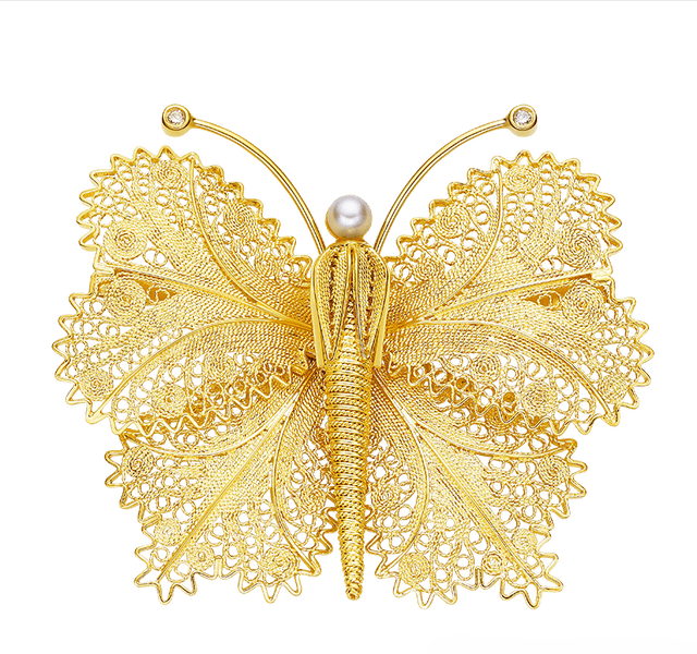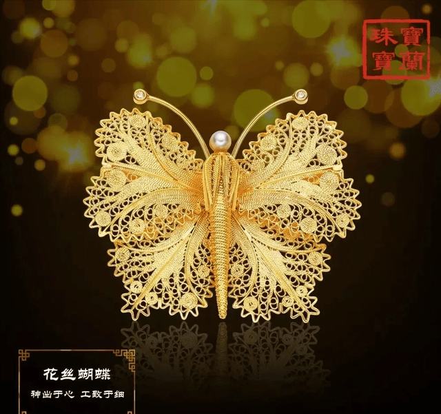 (二)花丝蝴蝶 花丝工艺打造栩栩如生的蝴蝶胸针,金丝描绘翅膀花纹脉络,身体镶嵌珍珠显优雅。 回收时,独特设计与精湛工艺加分,黄金无明显损耗、污染,商家会结合行情和工艺报价。
