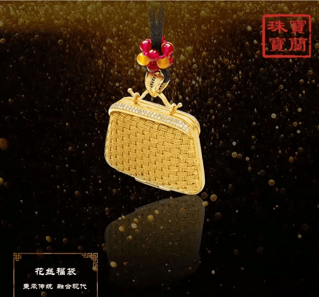(一)花丝福袋 以传统福袋为造型,花丝工艺细腻编织,金丝缠绕勾勒精致轮廓纹理,边缘点缀钻石添奢华。 回收时,因花丝工艺复杂、人工成本高,黄金纯度达标、成色良好的话,回收价会高于普通黄金饰品。