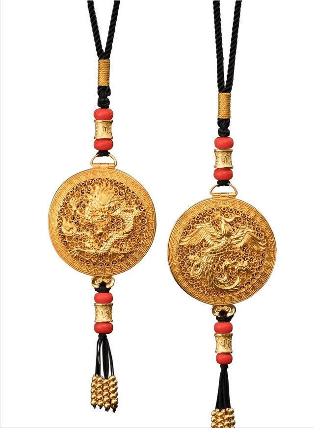 (二)龙凤呈祥系列吊坠 花丝工艺勾勒出威严的龙与柔美的凤,龙鳞、凤羽细节清晰,工艺精湛。 回收时,龙凤题材文化价值高,黄金纯度和重量达标、吊坠保存好,回收价更有保障。